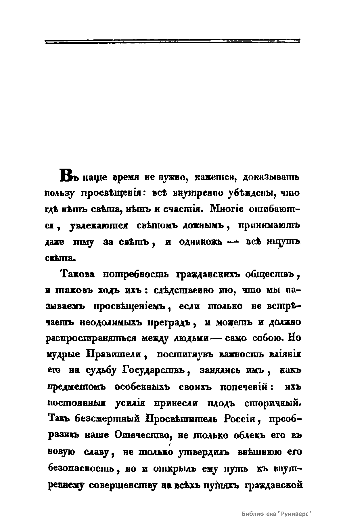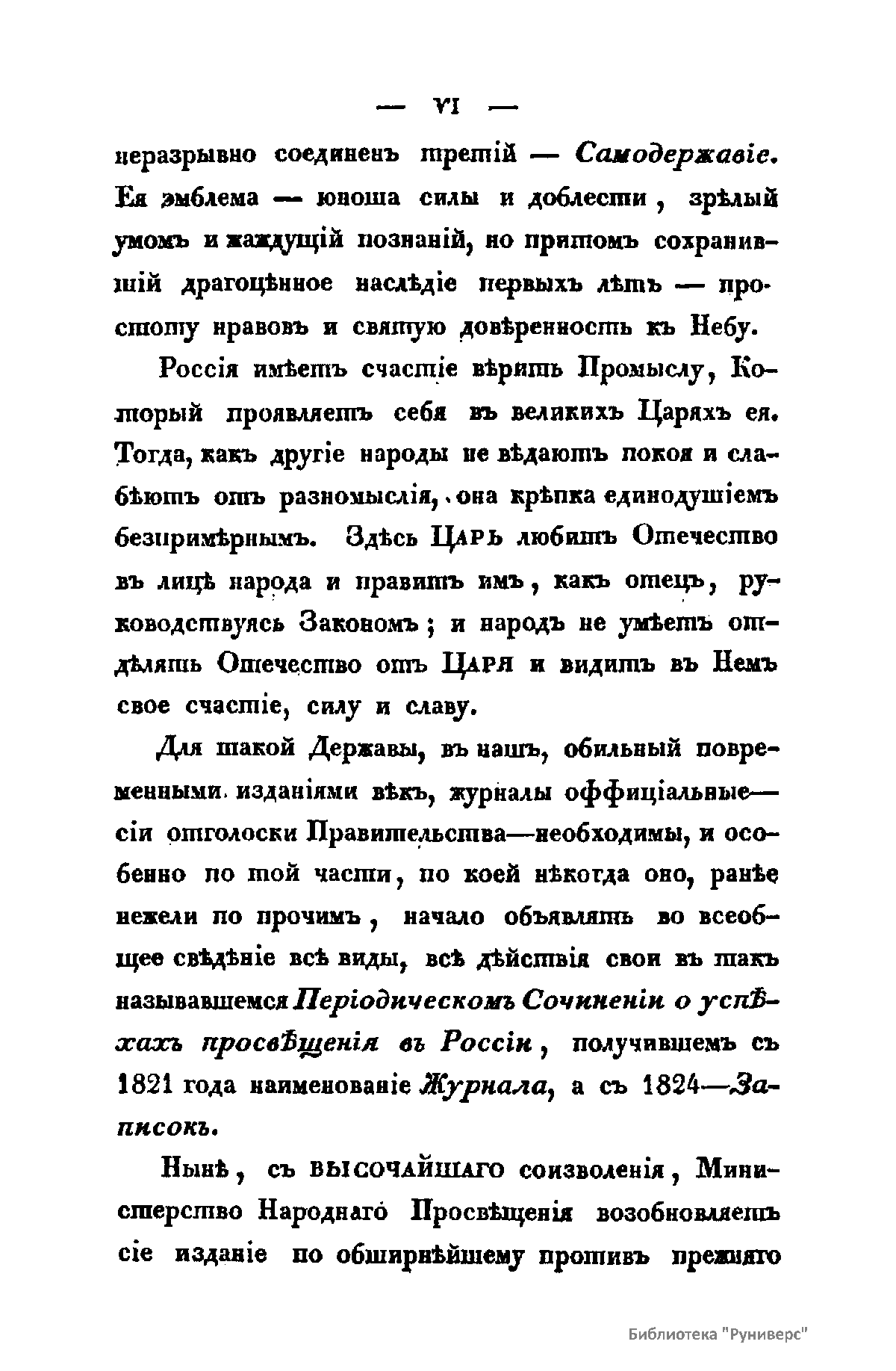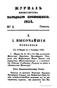Журнал Министерства народного просвещения выходил с 1834-го по 1917 год. Официальный периодический журнал об успехах просвещения в России. Издатели журнала уверены в том, что «если для каждого человека необходим выход из грубой тьмы невежества и беспрерывное дальнейшее движение к свету, то для народов необходимо попечительное участие правительства в образовании. Только правительство имеет все средства знать и высоту успехов всемирного образования, и настоящие нужды Отечества».