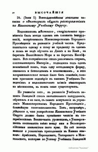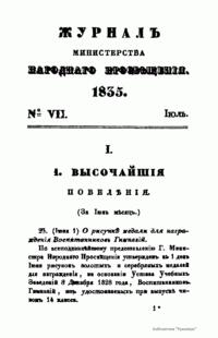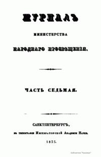 Журнал Министерства народного просвещения выходил с 1834-го по 1917 год. Официальный периодический журнал об успехах просвещения в России. Издатели журнала уверены в том, что «если для каждого человека необходим выход из грубой тьмы невежества и беспрерывное дальнейшее движение к свету, то для народов необходимо попечительное участие правительства в образовании. Только правительство имеет все средства знать и высоту успехов всемирного образования, и настоящие нужды Отечества».