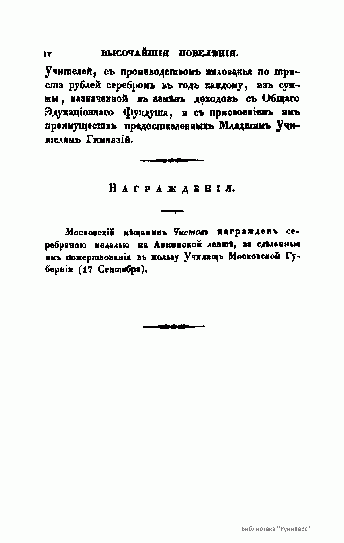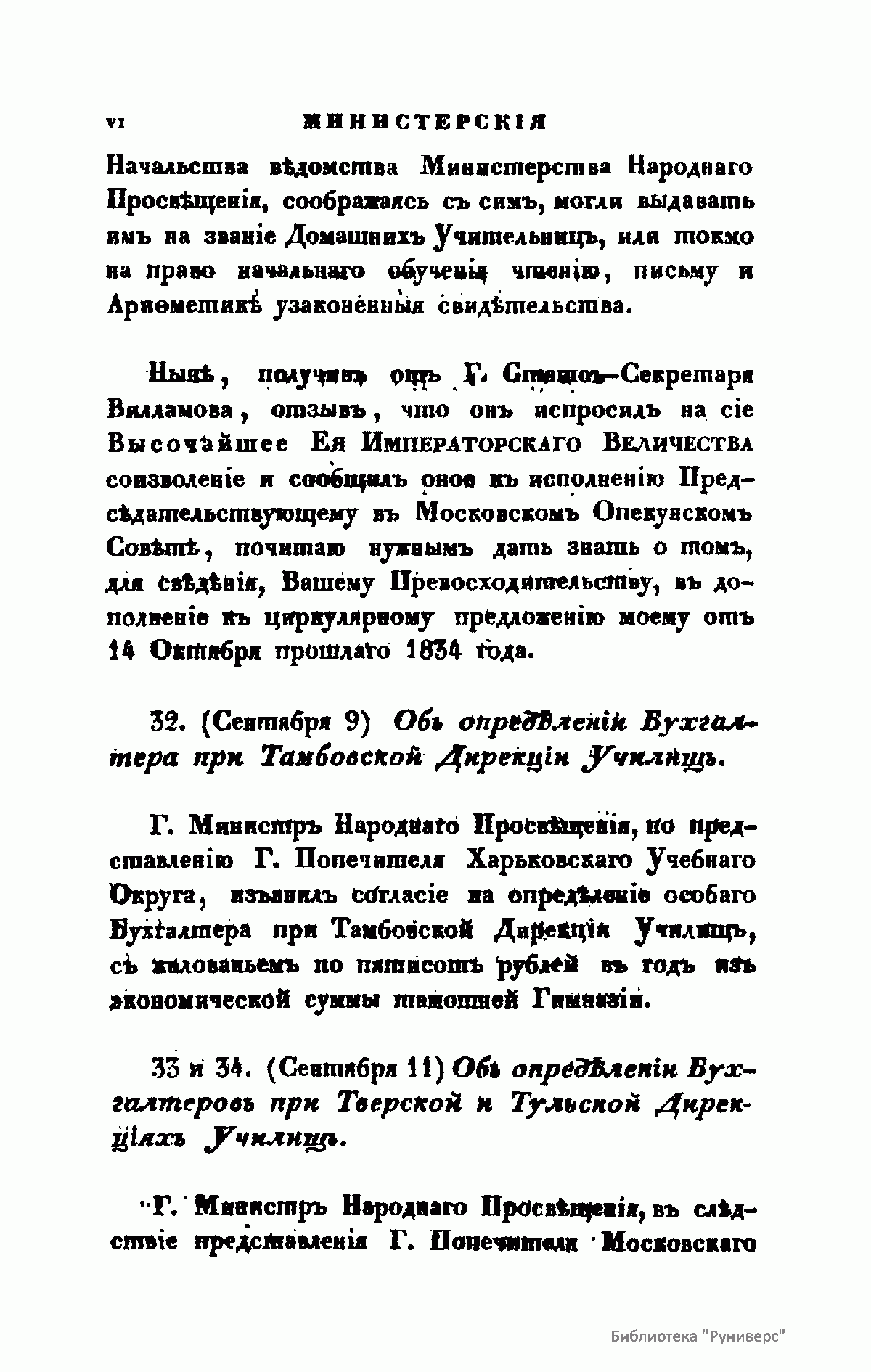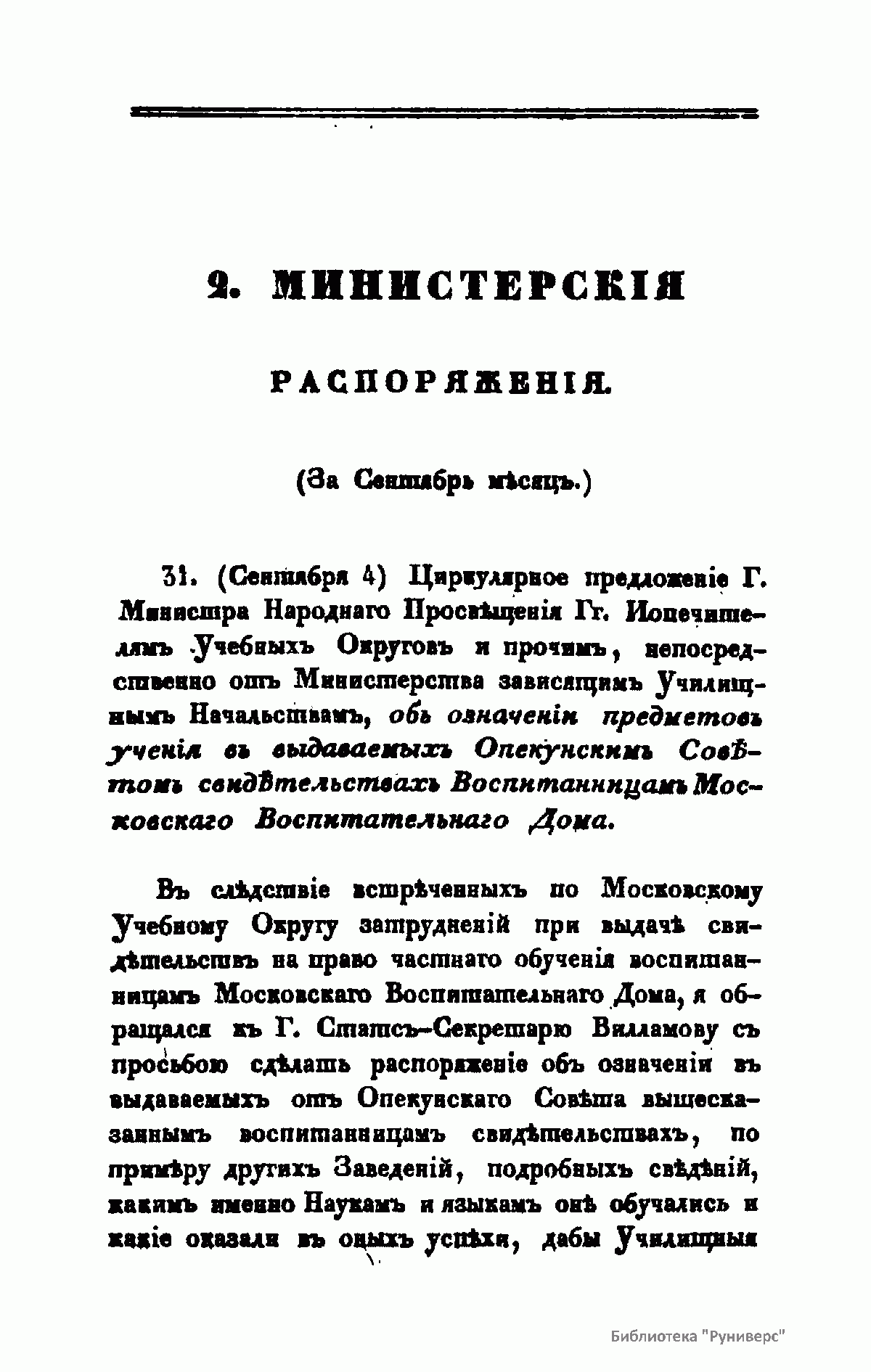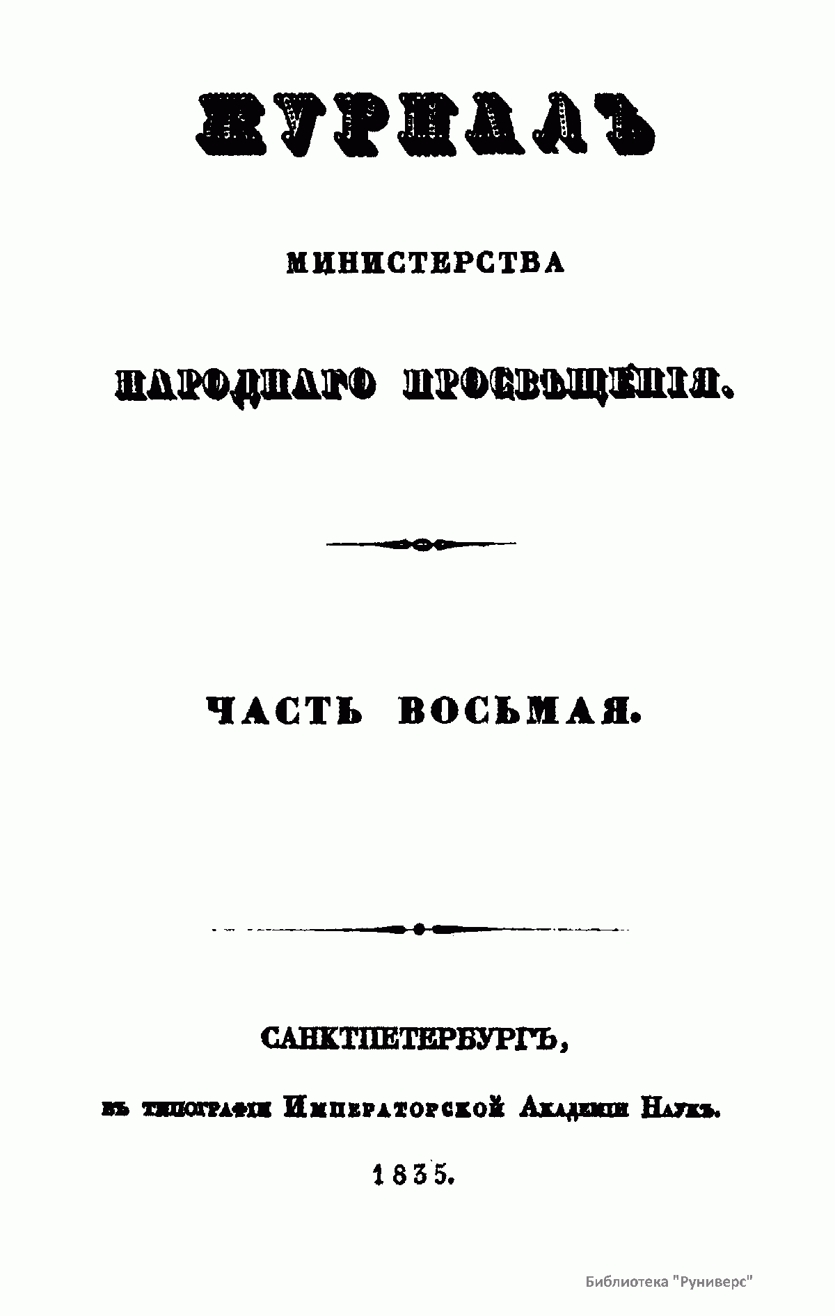 Журнал Министерства народного просвещения выходил с 1834-го по 1917 год. Официальный периодический журнал об успехах просвещения в России. Издатели журнала уверены в том, что «если для каждого человека необходим выход из грубой тьмы невежества и беспрерывное дальнейшее движение к свету, то для народов необходимо попечительное участие правительства в образовании. Только правительство имеет все средства знать и высоту успехов всемирного образования, и настоящие нужды Отечества».