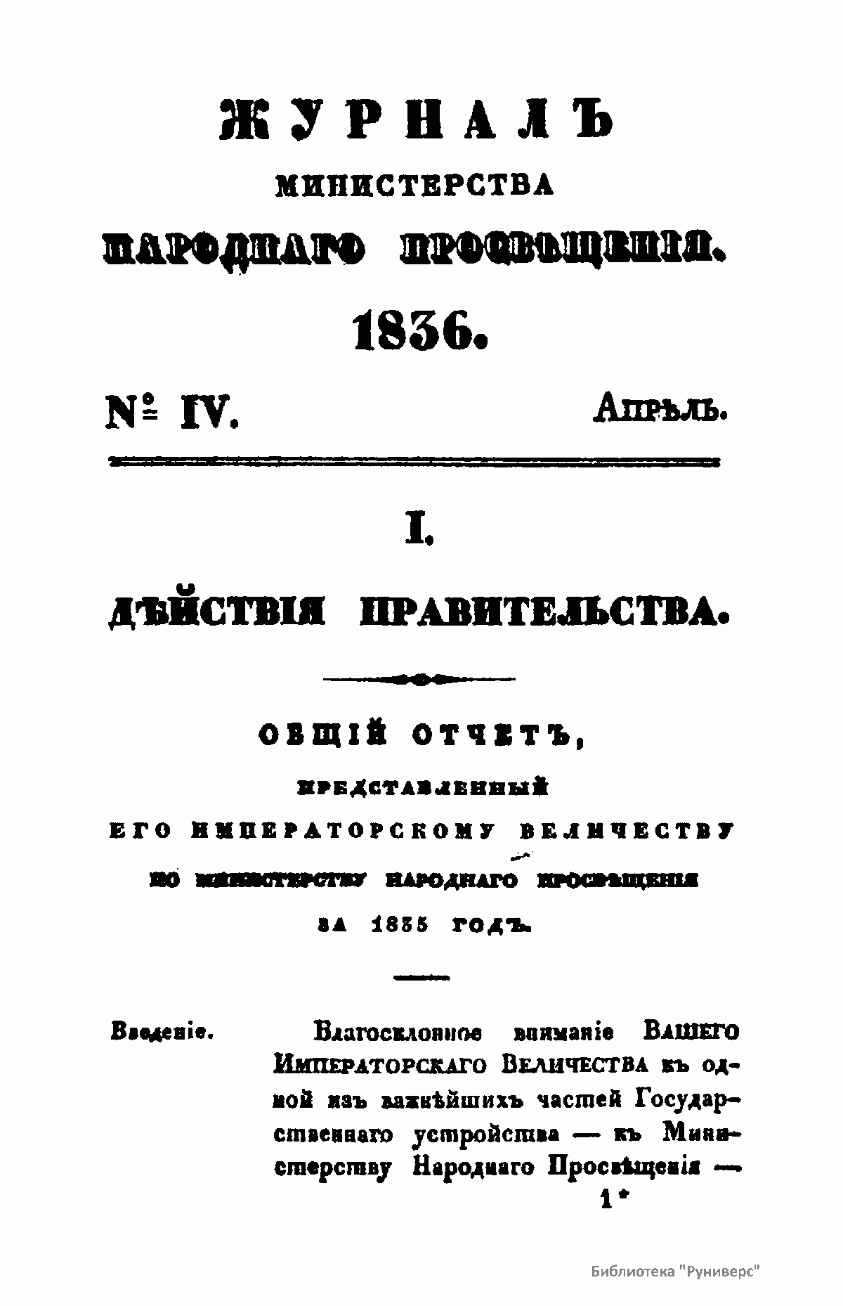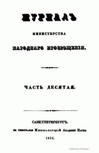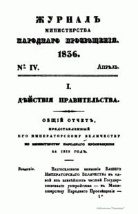 Журнал Министерства народного просвещения выходил с 1834-го по 1917 год. Официальный периодический журнал об успехах просвещения в России. Издатели журнала уверены в том, что «если для каждого человека необходим выход из грубой тьмы невежества и беспрерывное дальнейшее движение к свету, то для народов необходимо попечительное участие правительства в образовании. Только правительство имеет все средства знать и высоту успехов всемирного образования, и настоящие нужды Отечества».