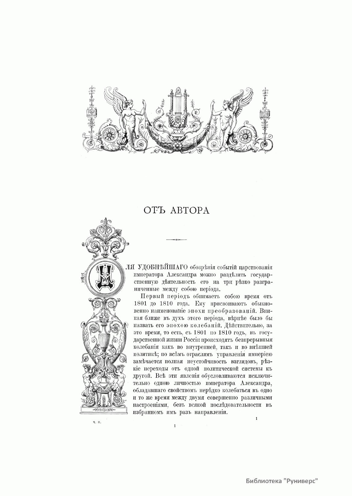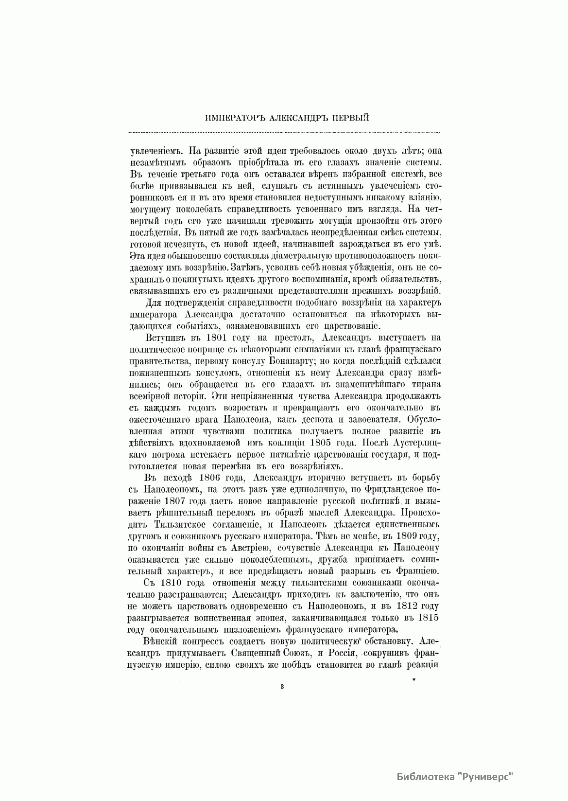 Сочинение Н. К. Шильдера «Император Александр I, его жизнь и царствование» является одной из богато иллюстрированных и основанных на большом фактическом материале книг, посвященных российским императорам. Оно состоит из четырех частей. Первая часть описывает детство и молодые годы Александра до восшествия его на престол; вторая — эпоху преобразований с 1801 по 1810 год; третья — борьбу с Францией с 1810 по 1816 год; четвертая — эпоху реакции с 1816 по 1825 год. Труд написан легко и увлекательно; главные его достоинства — искусный психологический анализ, тщательная и точная критика историографии и источников, обилие ранее неизвестных материалов по политической, военной, дипломатической истории, введенных в научный оборот. Книга углубляет историческое понимание эпохи Александра I. Иллюстрации выполнены с редких оригиналов собрания гравюр П. Я. Дашкова в техниках хромолитографии, фототипии, гелиогравюры, цинкографии, копии с картин, гравюр на дереве и фотографии. В издание вошли портреты: Императора Александра I, Великой княжны Александры Павловны, Великой княгини Анны Федоровны, графа Аракчеева, князя Безбородко, графа Строганова, князя Чарторижского, барона Штейна, Императора Александра Павловича, принца прусского Вильгельма, князя Волконского, князя Голицына, барона Кампенгауза и многих других, а также виды местностей, зданий, сцены баталий, бытовые рисунки. Николай Карлович Шильдер (1842–1902), русский историк, генерал-лейтенант, член-корреспондент Петербургской Академии наук. Окончил Пажеский корпус и Николаевскую инженерную академию.