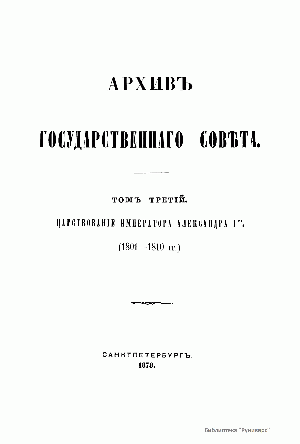 Архивъ Государственнаго совѣта. Томъ третiй. Совѣтъ въ царствованiе императора Александра I. 1801 - 1810 гг. Часть первая