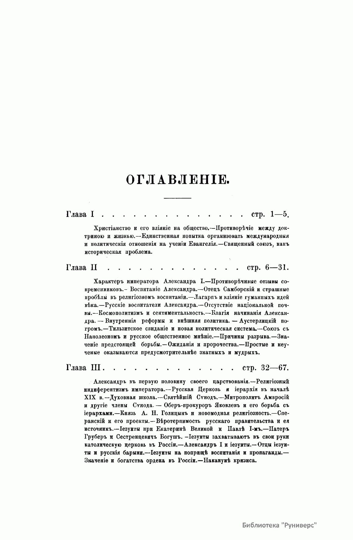 Пятитомное фундаментальное исследование профессора В. К. Надлера «Император Александр I и идея Священного союза» посвящено внешней политике России в 1812–1815 гг. с экскурсами в предшествовавшие и последующие времена и события. Издание было выпущено книгопродавцем Н. Киммелем в Риге в 1886–1892 гг., напечатано в харьковской типографии Окружного штаба. Автор сделал вывод, что идея Священного союза была единственной до начала ХIХ в. «серьезной и искренней попыткой организовать международные отношения на чистых началах христианской нравственности». Акт о Священном союзе содержал религиозно-мистическую фразеологию, возможно заимствованную из учения масонства. В статье I три договаривающихся монарха объявлялись соединенными «узами действительного и неразрывного братства», совсем как члены масонской ложи высоких степеней. Они именовались «тремя ветвями одной семьи» и обязывались помогать друг другу в открытии «сокровищ любви, науки и беспредельной мудрости». Сочинение В. К. Надлера на историческом материале было призвано показать, что создание Священного союза опередило свое время, и не было понято современниками. Том I повествует о внутренней политике в России при Александре I. В нем рассматриваются вопросы внешней политики европейских держав, отношение к Наполеону и Отечественная война 1812 г. Том II рассказывает о завершении Отечественной войны — изгнании французов с земель России, а также переговоры и дипломатические отношения России с союзниками, подготовка к дальнейшей войне против Франции. Том III подводит итог прошедшей войне, здесь рассматриваются стратегические планы на 1813 г., переговорный процесс с союзниками и начало весенней кампании 1813 г. Анализируется ход сражений 1813 г. Том IV повествует о событиях 1814 г.: поражение Наполеона, оккупация Франции, восстановление монархии Бурбонов, переговоры и дипломатическая борьба союзников. Том V рассказывает о событиях 1815 г.: созыв Венского конгресса и его решения о создании Священного Союза, «100 дней» Наполеона и борьба с ним, вторичное восстановление монархии Бурбонов. Василий Карлович Надлер (1844–1894) — историк, профессор Харьковского, Новороссийского университета. Главные труды: «Причины и первые проявления оппозиции католицизму в Чехии и Западной Европе в конце XIV и начала XV века» (Харьков, 1864; магистерская диссертация); «Адальберт Бременский, правитель Германии в молодые годы Генриха IV» (Харьков, 1967; докторская диссертация); «Мифический элемент в истории» (Харьков, 1887) и др.