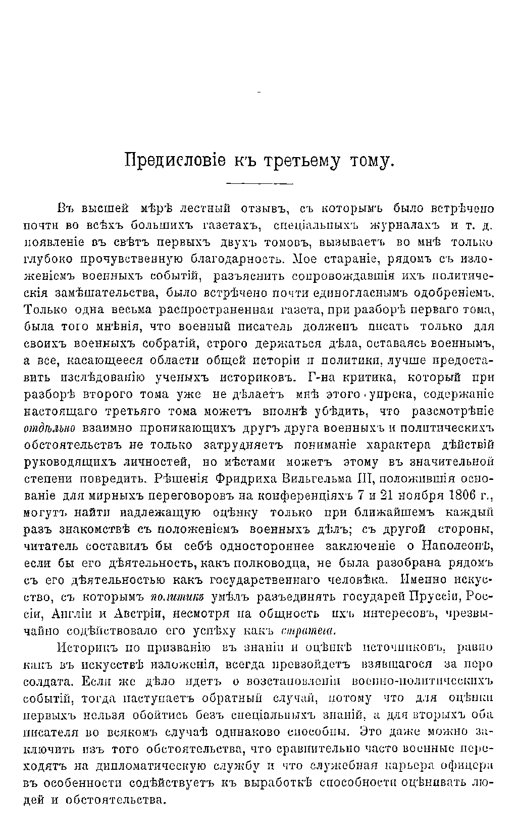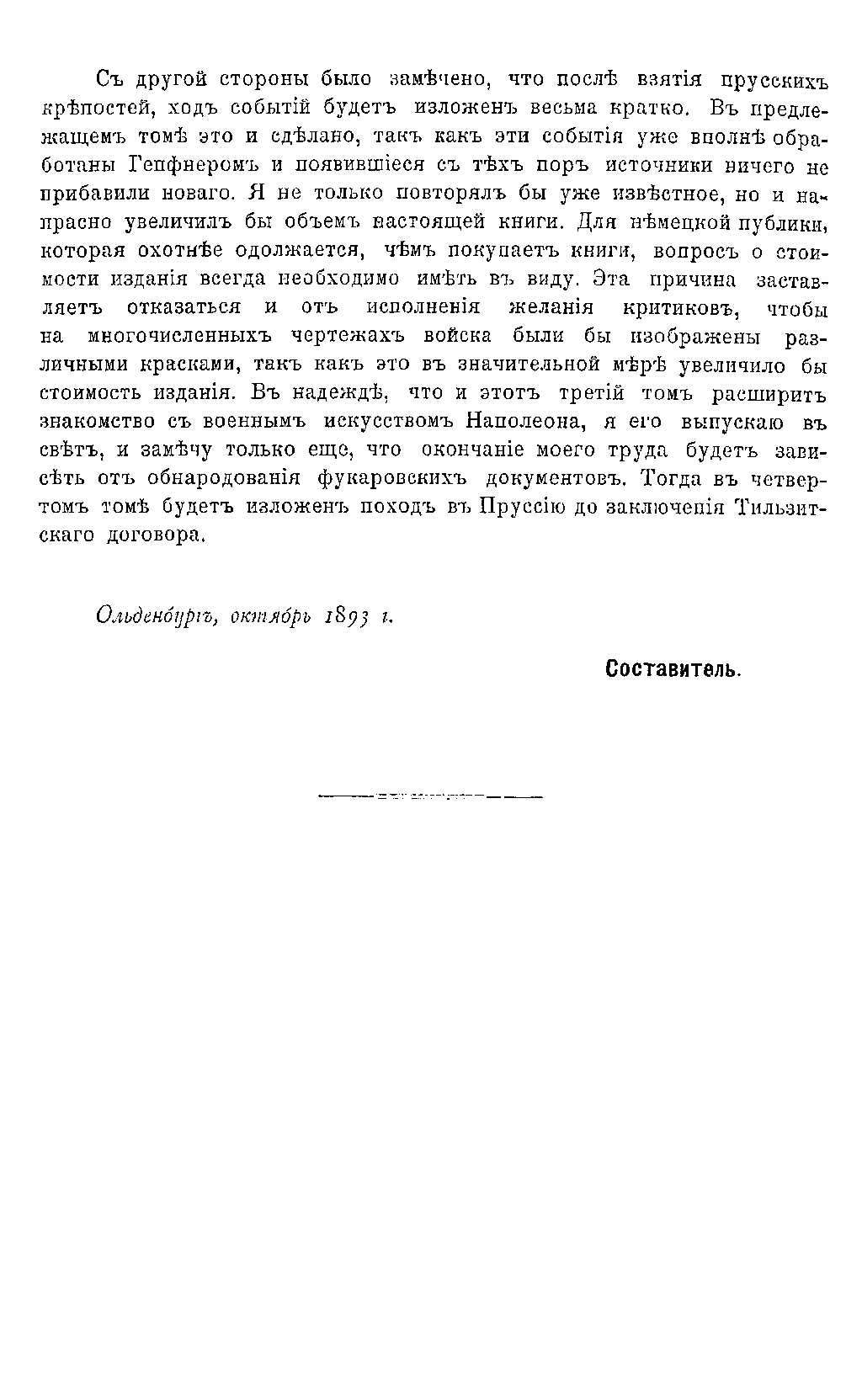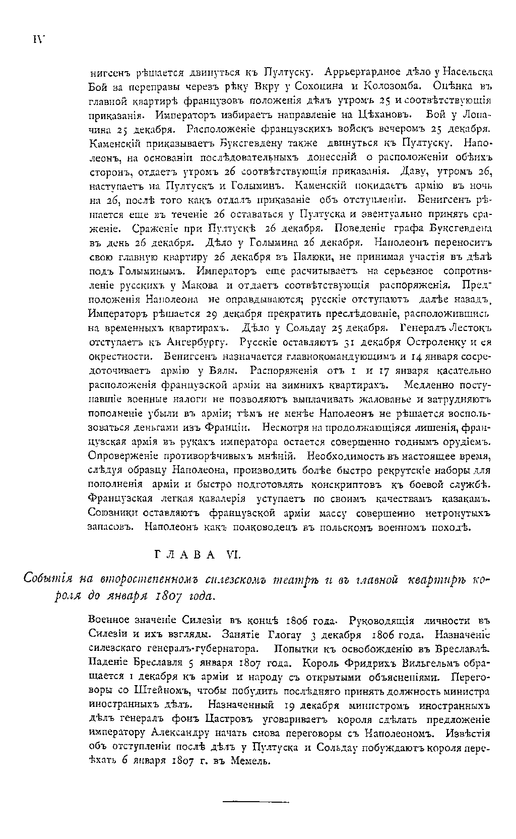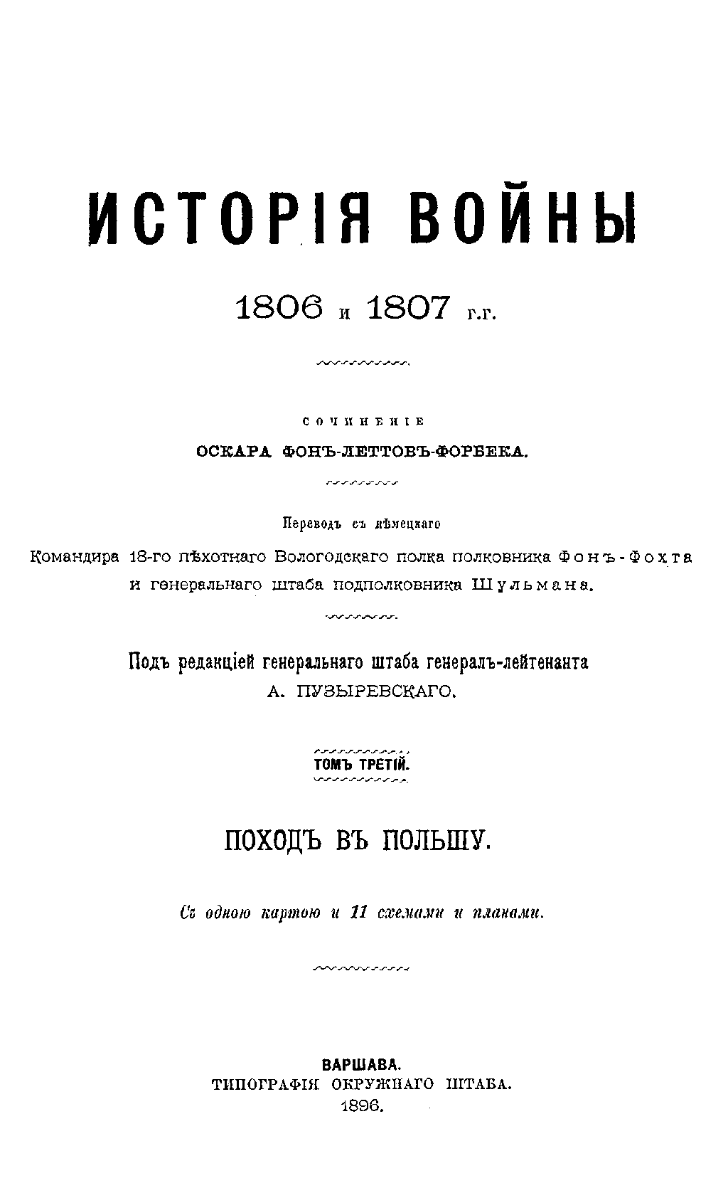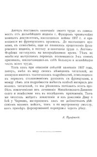 Перевод на русский язык фундаментального многотомного военно-исторического труда по истории войны русско-прусского союза с Наполеоном в 1806-1807 годах, написанного немецким военным историком Оскаром фон Леттов-Форбеком, был подготовлен при штабе Варшавского военного округа под руководством генерал-лейтенанта Генерального штаба, профессора военной истории академии Генерального штаба А.К. Пузыревского, получив при этом одобрение Военного министерства. Деятельность А.К. Пузыревского как одного из выдающихся военных педагогов и просветителей получила в России широкую известность. Представленное им исследование немецкого военного писателя, снабженное многочисленными картами и схемами боевых действий, сих пор представляет научный интерес. Одним из важнейших достоинств данного исследования является то, что автор широко использовал богатейший документальный массив как прусских, так и французских военных архивов, создав объективную картину одного из сложнейших этапов эпохи наполеоновских войн. Русско-прусско-французская война 1806-1807 гг. война между 4-й коалицией европейских держав (Великобритания, Россия, Пруссия, Саксония, Швеция) и наполеоновской Францией. Фактически эти две кампании являлась продолжением русско-австро-французской войны 1805 г. Не имея общего плана войны, союзники действовали несогласованно, что позволило Наполеону разбить их поочерёдно. Так 2 (14) октября 1806 г. в масштабном сражении под Йеной и Ауэрштадтом французская армия разгромила прусско-саксонские войска, после чего наполеоновские войска оккупировали большую часть Пруссии и 12 (24) октября заняли Берлин. Русская армия в составе трёх корпусов (около 160 тыс. чел.) под командованием генерал-фельдмаршала М. Ф. Каменского сосредоточилась в районе Пултуск, Остроленка, Брест-Литовск, выдвинув передовые отряды к Висле. 16 (28) ноября французские войска заняли Варшаву. Наполеон предпринял попытку окружить главные силы русских войск, но 14 (26) декабря в сражении под Пултуском русские войска сорвали этот план, нанеся поражение корпусу маршала Ж. Ланна. Затем русская армия отошла в район Тыкоцина, а наполеоновские войска расположились на зимние квартиры. 4 (16) января 1807 русская армия под командованием нового командующего генерал-адъютанта Л.Л. Беннигсена начала наступление из района Бялы в Восточную Пруссию с целью не допустить занятия французами Кенигсберга и Пиллау и нанести поражение изолированным корпусам Нея и Бернадота. Наполеон, узнав о продвижении русских войск, 20 января (1 февраля) направил главные силы на север, пытаясь обойти левый фланг русской армии и отрезать экспедиционные силы русских от России. Русские войска, ведя арьергардные бои, отошли к Прейсиш-Эйлау, где 26–27 января (7– 8 февраля) произошло встречное упорное сражение, в котором русские войска успешно отразили удары наполеоновской армии. 2 (14) июня 1807 г. в сражении под Фридландом русская армия, проявив чудеса героизма и мужества, вследствие неадекватных мер командования, была вынуждена отступить. В июне 1807 г. состоялось свидание Наполеона с императором Александром I в Тильзите и был подписан тяжёлый для России вынужденный союзный договор с наполеоновской Францией. Все эти военно-исторические события детально изложены в данном труде.