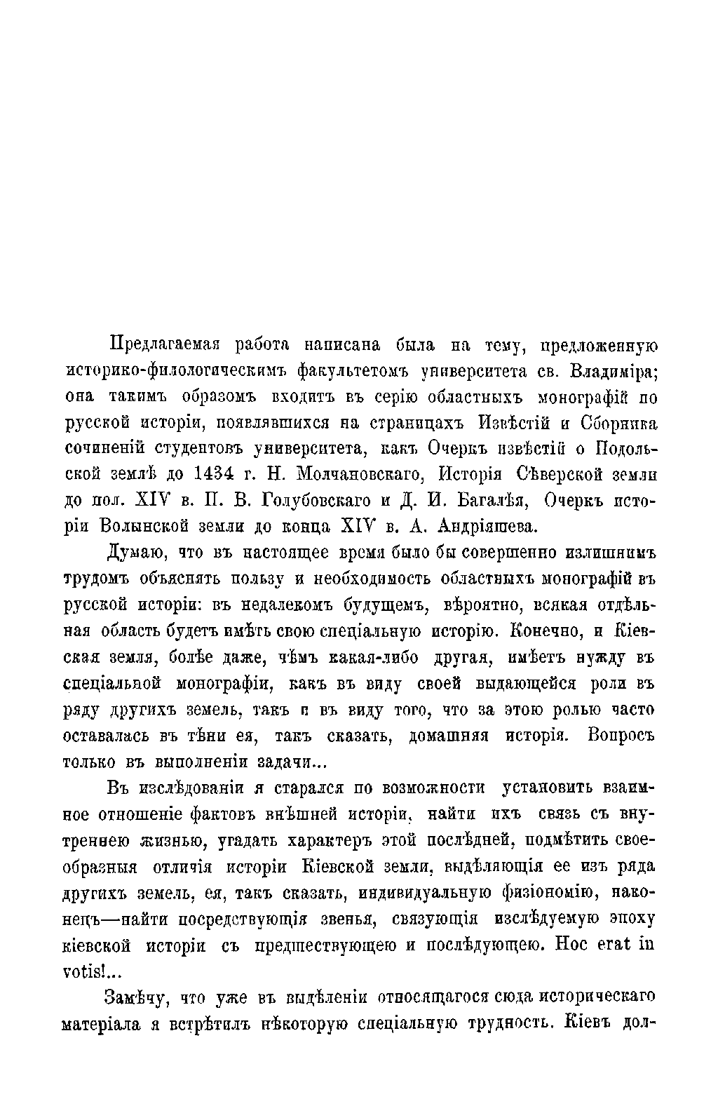 На историко-филологическом факультете Киевского университета св. Владимира в конце XIX в. велась серьёзная научная работа по изучению истории Древней Руси. Результатом этой работы явилась серия областных монографий. В эту серию входит и предлагаемое исследование М. С. Грушевского. Оно знакомит с историей Киевской земли от смерти Ярослава до конца XIV столетия.