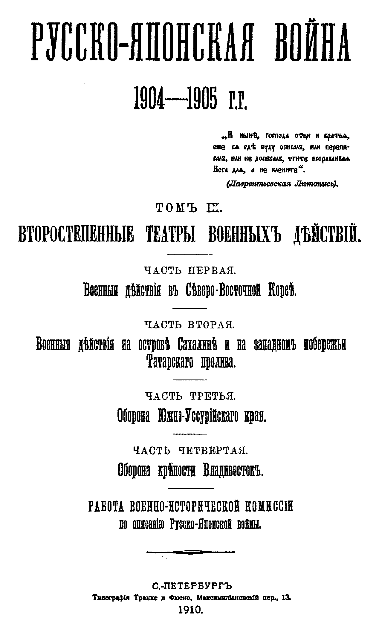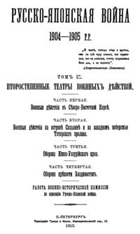 Русско-Японская война 1904-1905 гг. Томъ IX. Второстепенные театры военныхъ дѣйствiй. Часть первая. Военныя дѣйствiя в Сѣверо-Восточной Кореѣ. Часть вторая. Военныя дѣйствiя на островѣ Сахалинѣ и на западномъ побережьи Татарскаго пролива. Часть третья. Оборона Южно-Уссурiйскаго края. Часть четвертая. Оборона крѣпости Владивостокъ