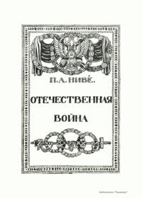 Книга военного историка, полковника Петра Андреевича Ниве «Отечественная война» является юбилейным изданием 1912 г., которое имело целью восстановить точную, во всех ее деталях историческую канву событий Отечественной войны 1812 г. Данное издание богато иллюстрировано, в нем представлены планы и карты всех крупных сражений «Русской кампании Наполеона».