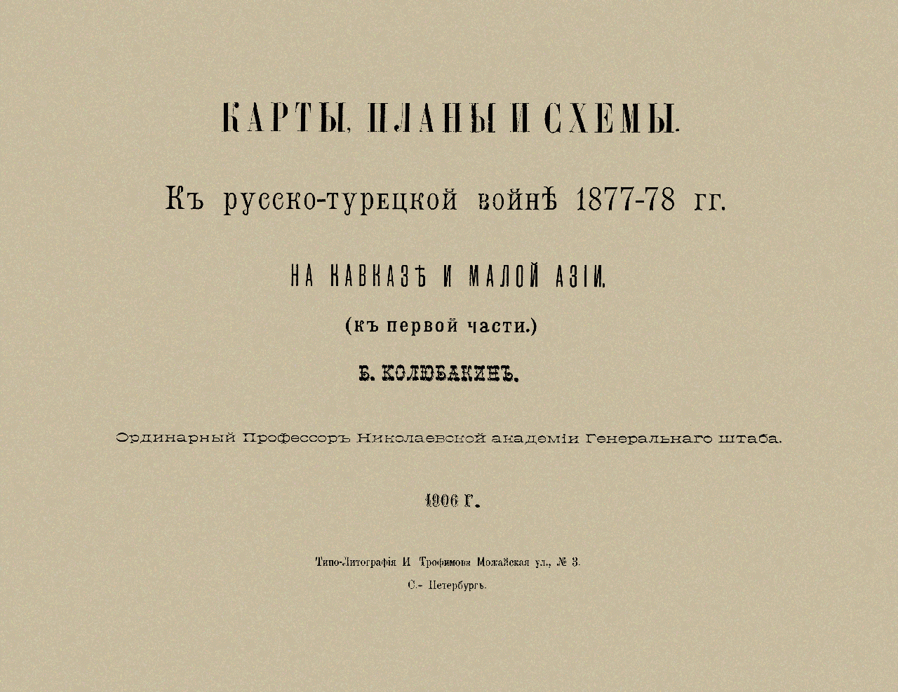 Колюбакин Борис Михайлович (1853–1924) — военный историк и писатель, генерал-лейтенант, участник русско-турецких войн, впоследствии — профессор Николаевской академии Генерального штаба. Его перу принадлежит ряд военно-исторических исследований и работ, большей частью посвященных войне с Турцией. Среди них — «Эриванский отряд в кампанию 1877–1878 гг.», «Воспоминания офицера Кобулетского отряда в кампании 1877–1878 гг.», «Конспект Русско-турецкой войны 1877–1878 гг.».