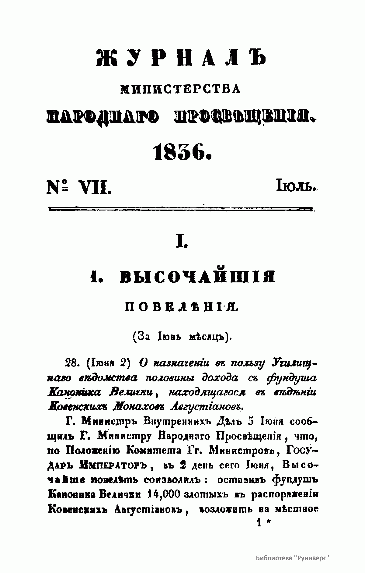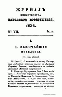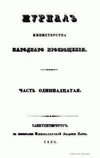 Журнал Министерства народного просвещения выходил с 1834-го по 1917 год. Официальный периодический журнал об успехах просвещения в России. Издатели журнала уверены в том, что «если для каждого человека необходим выход из грубой тьмы невежества и беспрерывное дальнейшее движение к свету, то для народов необходимо попечительное участие правительства в образовании. Только правительство имеет все средства знать и высоту успехов всемирного образования, и настоящие нужды Отечества».