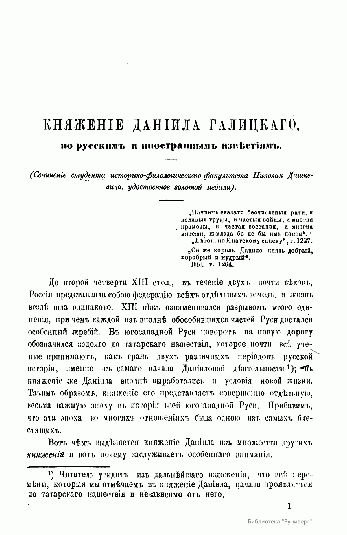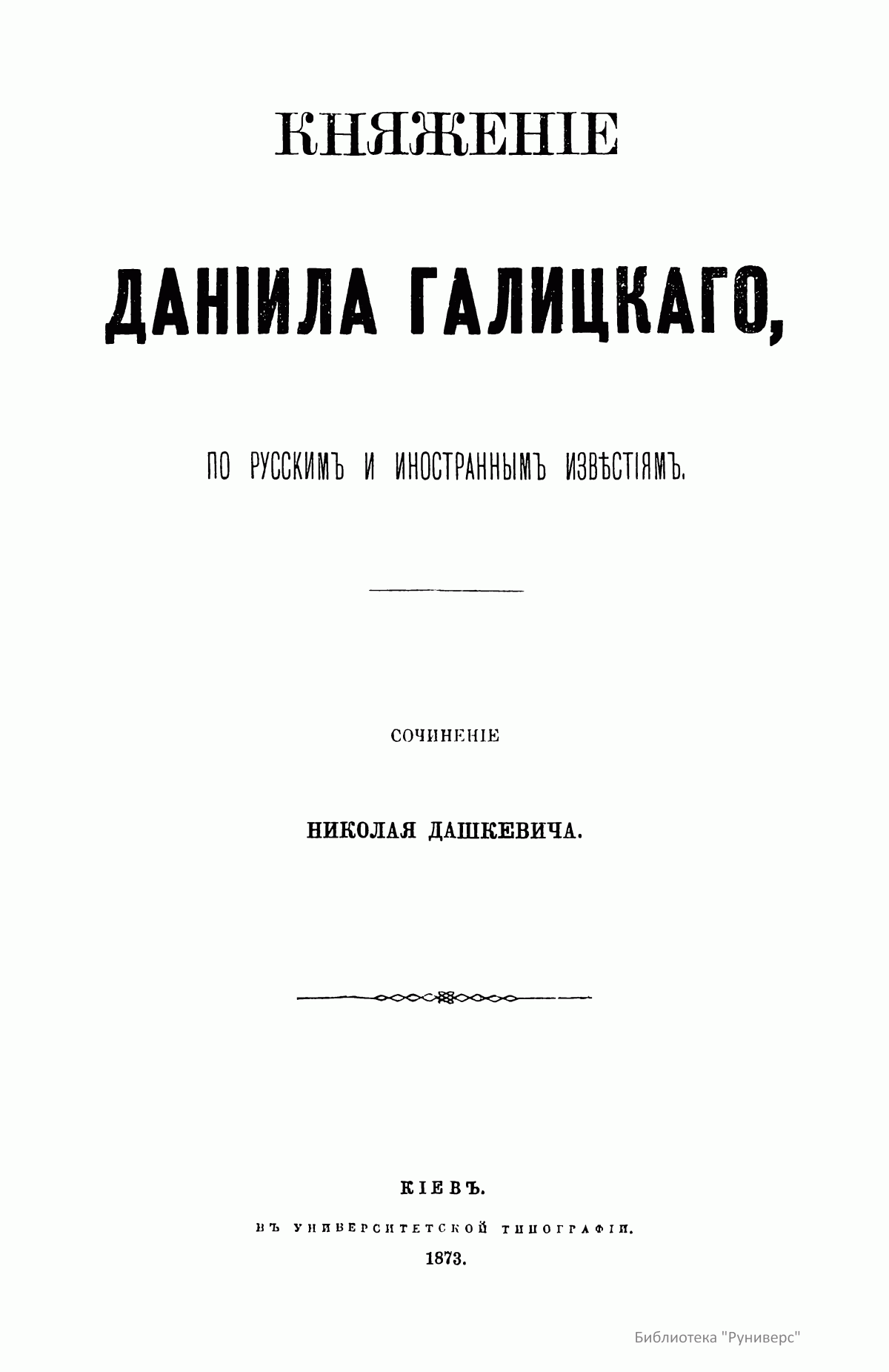 В книге опубликовано сочинение студента историко-филологического факультета Киевского университета св. Владимира, удостоенное золотой медали. Задача настоящего труда – указать и объяснить посредством сравнительно-исторического изучения русских и иностранных источников «замечательные явления» княжения Даниила Галицкого (1201 – 1264), которыми определяется историческое значение этого княжения. При Данииле значительная по объему юго-западная часть Руси отделилась от прочих русских земель и начала жить особенной жизнью. Она значительно окрепла, благодаря тому, что представляла собой на время как бы одно целое. Единение это долго не продолжалось, но важно было то, что юго-западная Русь сосредоточилась в руках меньшего числа лиц, принадлежавших одному роду. Княжение Даниила отсрочило на целое столетие падение юго-западной Руси и тягости чужеземного ига. Существуя в течение целого столетия после татарского нашествия, юго-западная Русь отвлекала внимание Литвы от востока, принимала на себя ее удары и давала возможность Москве крепнуть, в то время как Псков и Новгород не допускали к Москве ливонцев.