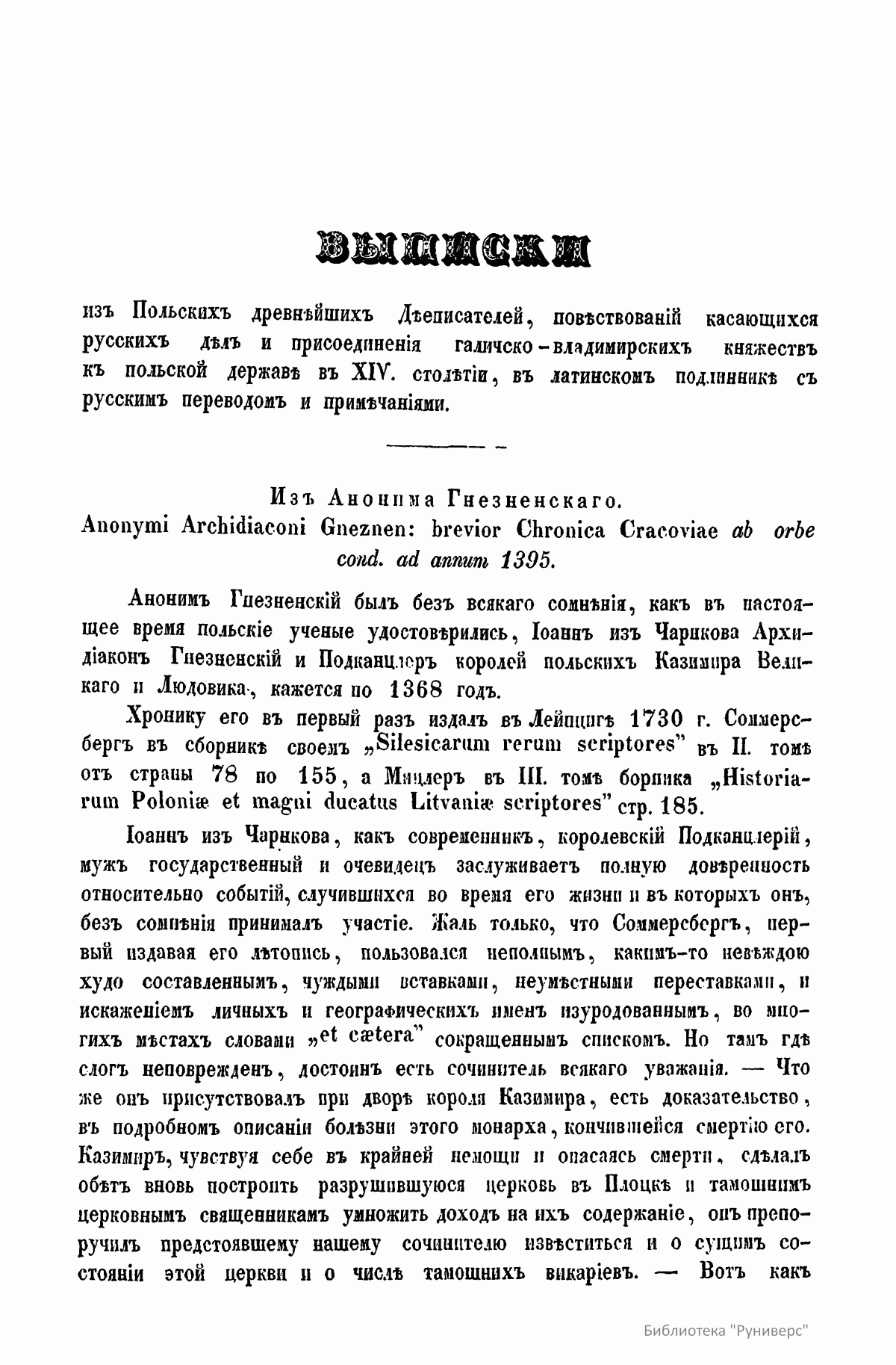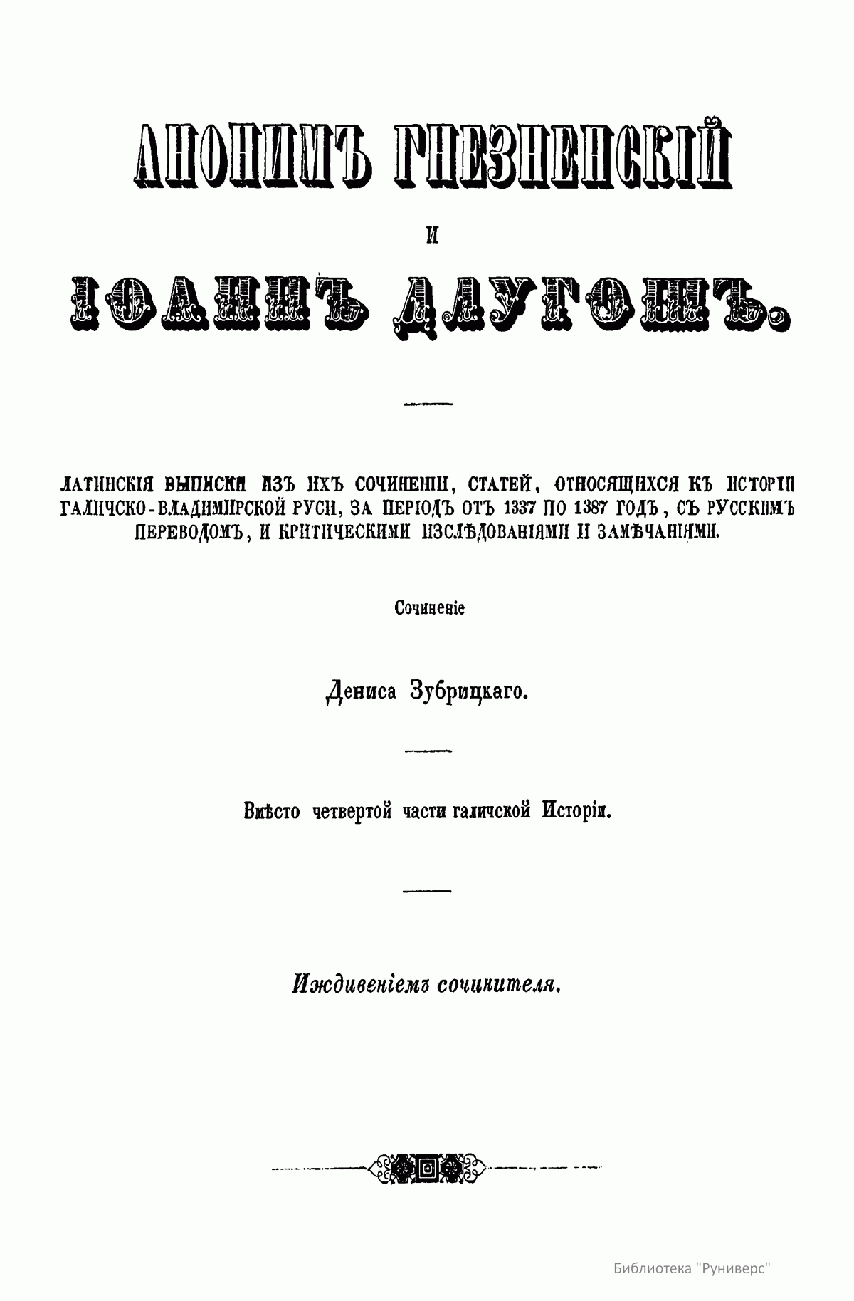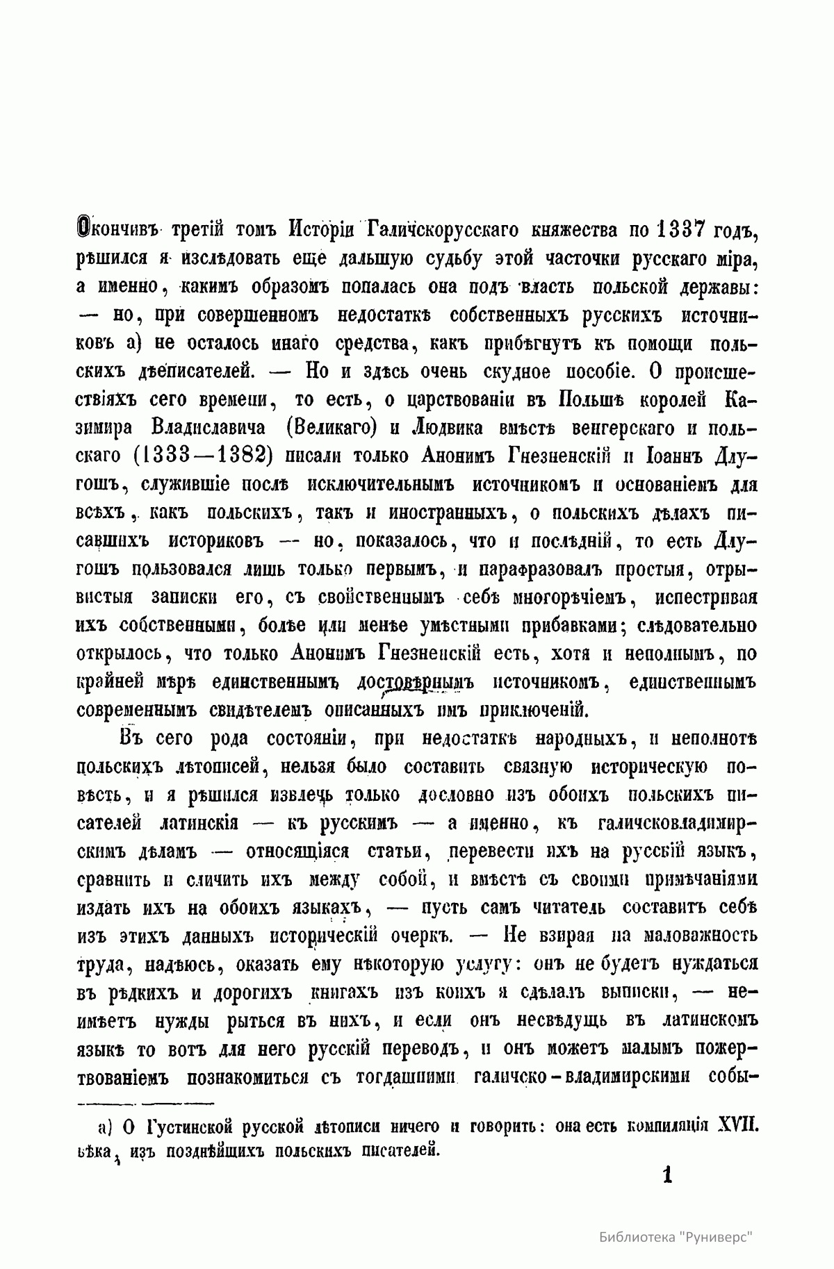 Автор адресует свой труд «истинным любителям науки и исторических разыскиваний». В книге опубликованы латинские выписки из сочинений польских историков Анонима Гнезненского и Иоанна Длугоша, относящиеся к истории Галицко-Владимирской Руси, за период от 1337-го по 1387 год, с русским переводом и критическими замечаниями. Автор ставит цель исследовать, каким образом эта часть русского мира попала под власть польской державы. Во вступлении дана характеристика европейского Севера, к которому принадлежала и Галиция, в древности. Поселившийся на севере Европы многочисленный славянский народ разделился на два мира - русский и лядский (польский). Первым управляли потомки Рюрика, а вторым потомки Пяста. Когда в русском мире с кончиной Ярослава Мудрого, а в лядском мире с кончиной Болеслава Кривоустого прекратилось единодержавие, оба мира распались на множество больших и малых удельных княжеств, которые тем не менее оставались исключительным достоянием обоих господствовавших родов. В XIV столетии в обоих мирах разъединенные части стали сливаться в большие государства. Однако в лядском мире возникло два польских королевства, два польских короля: Иоанн Слепой король чешский писался польским королем, и Казимир Владиславович Великий употреблял титул польского короля. Равным образом в две отдельные системы сгруппировался и русский мир: в состоявшую тогда под монгольским владычеством Русь и в литовскую Русь. В татарской Руси московские князья в борьбе с тверской линией Рюриковичей за великокняжеское достоинство, в попытке низвергнуть татарское иго, в стремлении покорить мелкие единородные княжества и усмирить своевольную новгородскую республику, стали только предвещать будущее свое величие. Совсем другим образом устроилась западная Русь, литворусская держава. После смерти королевича Шварно Даниловича в Литве настала новая династия Гедиминовичей. Сначала Гедиминовичи завладели оружием многими русским землями, а после через вступление в браки с русскими княжнами сроднились с Рюриковичами, приняли русское вероисповедание, язык и обычаи. Образовался сильный союз больших и меньших князей Гедиминовичей и Рюриковичей с удивительным согласием между собой: они воевали вместе против прусских крестоносцев, поляков, венгров, татар, татарам подвластных северо-восточных русских князей, освободили западную Русь от татарского данничества. Так возникла Литовская Русь. Во второй половине XIII столетия между реками Вислой, Неманем и Балтийским морем, между пределами Польши, Литвы и Руси зародилось и устроилось новое странное государство воинов-монахов – прусских крестоносцев, которых поляки называли Крижаками. Эта держава постоянно усиливалась бродячими рыцарями целого запада Европы и достигло в XIV веке могущества: было грозой соседних народов и имело большое влияние на дела северной Европы. Польский король Казимир в 1343 году заключил с опасными соседями невыгодный мир, уступив им большую часть исконных земель, а литворусский союз боролся с ними почти целое столетие и сохранил в целости свое достояние. Кроме этих главных держав, действовавших на севере Европы, по берегам Черного моря расстилались татарские жилища, но их прежнее могущество теряло свой блеск. Татары и Людвиг король венгерский – сперва как сродник-союзник польского коро