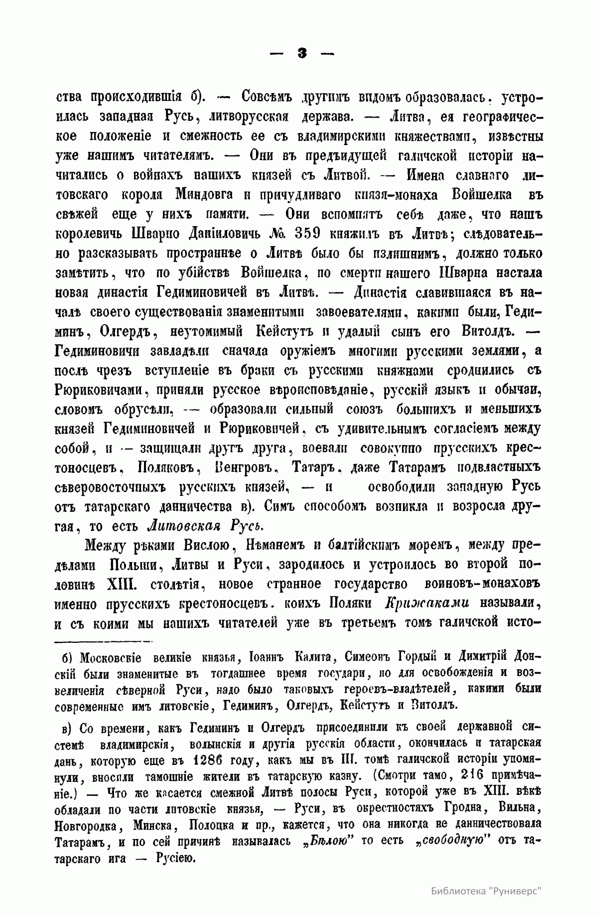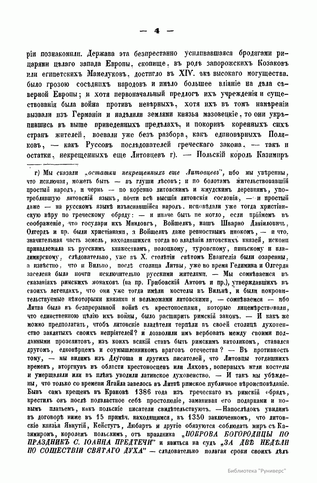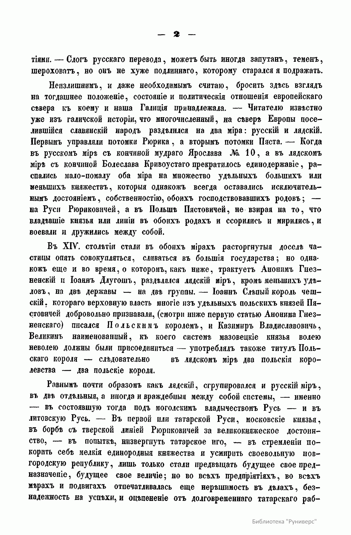 Автор адресует свой труд «истинным любителям науки и исторических разыскиваний». В книге опубликованы латинские выписки из сочинений польских историков Анонима Гнезненского и Иоанна Длугоша, относящиеся к истории Галицко-Владимирской Руси, за период от 1337-го по 1387 год, с русским переводом и критическими замечаниями. Автор ставит цель исследовать, каким образом эта часть русского мира попала под власть польской державы. Во вступлении дана характеристика европейского Севера, к которому принадлежала и Галиция, в древности. Поселившийся на севере Европы многочисленный славянский народ разделился на два мира - русский и лядский (польский). Первым управляли потомки Рюрика, а вторым потомки Пяста. Когда в русском мире с кончиной Ярослава Мудрого, а в лядском мире с кончиной Болеслава Кривоустого прекратилось единодержавие, оба мира распались на множество больших и малых удельных княжеств, которые тем не менее оставались исключительным достоянием обоих господствовавших родов. В XIV столетии в обоих мирах разъединенные части стали сливаться в большие государства. Однако в лядском мире возникло два польских королевства, два польских короля: Иоанн Слепой король чешский писался польским королем, и Казимир Владиславович Великий употреблял титул польского короля. Равным образом в две отдельные системы сгруппировался и русский мир: в состоявшую тогда под монгольским владычеством Русь и в литовскую Русь. В татарской Руси московские князья в борьбе с тверской линией Рюриковичей за великокняжеское достоинство, в попытке низвергнуть татарское иго, в стремлении покорить мелкие единородные княжества и усмирить своевольную новгородскую республику, стали только предвещать будущее свое величие. Совсем другим образом устроилась западная Русь, литворусская держава. После смерти королевича Шварно Даниловича в Литве настала новая династия Гедиминовичей. Сначала Гедиминовичи завладели оружием многими русским землями, а после через вступление в браки с русскими княжнами сроднились с Рюриковичами, приняли русское вероисповедание, язык и обычаи. Образовался сильный союз больших и меньших князей Гедиминовичей и Рюриковичей с удивительным согласием между собой: они воевали вместе против прусских крестоносцев, поляков, венгров, татар, татарам подвластных северо-восточных русских князей, освободили западную Русь от татарского данничества. Так возникла Литовская Русь. Во второй половине XIII столетия между реками Вислой, Неманем и Балтийским морем, между пределами Польши, Литвы и Руси зародилось и устроилось новое странное государство воинов-монахов – прусских крестоносцев, которых поляки называли Крижаками. Эта держава постоянно усиливалась бродячими рыцарями целого запада Европы и достигло в XIV веке могущества: было грозой соседних народов и имело большое влияние на дела северной Европы. Польский король Казимир в 1343 году заключил с опасными соседями невыгодный мир, уступив им большую часть исконных земель, а литворусский союз боролся с ними почти целое столетие и сохранил в целости свое достояние. Кроме этих главных держав, действовавших на севере Европы, по берегам Черного моря расстилались татарские жилища, но их прежнее могущество теряло свой блеск. Татары и Людвиг король венгерский – сперва как сродник-союзник польского коро