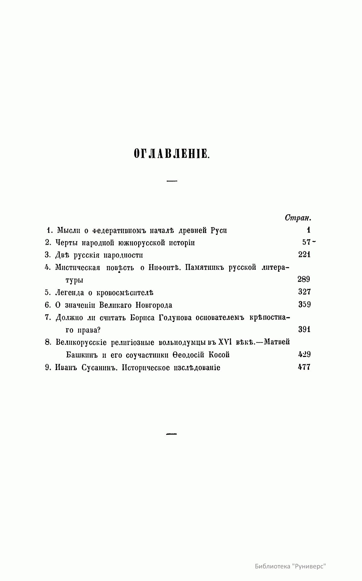 Перед читателем прижизненное издание трудов Н. И. Костомарова, в котором удачно соединялись историк-мыслитель и художник, что обеспечило ему не только одно из первых мест в ряду русских историков, но и наибольшую популярность среди читающей публики. Глубоко вдумываясь, почти вживаясь в изучаемую им старину, он воспроизводил ее в своих работах такими яркими красками, в таких выпуклых образах, что она надолго оставалась в памяти читателя. В первых трех томах и в двенадцатом томе опубликованы различные статьи. 1 – «Мысли о федеративном начале древней Руси»; «Черты народной южнорусской истории»; «Две русские народности»; «Мистическая повесть о Нифонте. Памятник русской литературы»; «Легенда о кровосмесителе»; «О значении Великого Новгорода»; «Должно ли считать Бориса Годунова основателем крепостного права?»; «Великорусские религиозные вольнодумцы в XVI веке. – Матвей Башкин и его соучастник Феодосий Косой»; «Иван Сусанин. Историческое исследование». 2 – «Иван Свирговский, украинский казацкий гетман XVI века»; «Гетманство Выговского»; «Бунт Стеньки Разина»; «По поводу мыслей светского человека, о книге «Сельское духовенство». 3 – «Куликовская битва»; «Ливонская война»; «Южная Русь в конце XVI века»; «Литовская народная поэзия»; «Об отношении русской истории к географии и этнографии». 12 – «Начало единодержавия в Древней Руси»; «Гетманство Юрия Хмельницкого»; «Церковно-историческая критика в XVII веке»; «История раскола у раскольников»; «Воспоминания о молоканах». Четвертый, пятый и шестой тома посвящены Смутному времени московского государства в начале XVII столетия. Седьмой и восьмой – истории Новгорода, Пскова и Вятки во время удельно-вечевого уклада. Девятый, десятый и одиннадцатый – Богдану Хмельницкому.