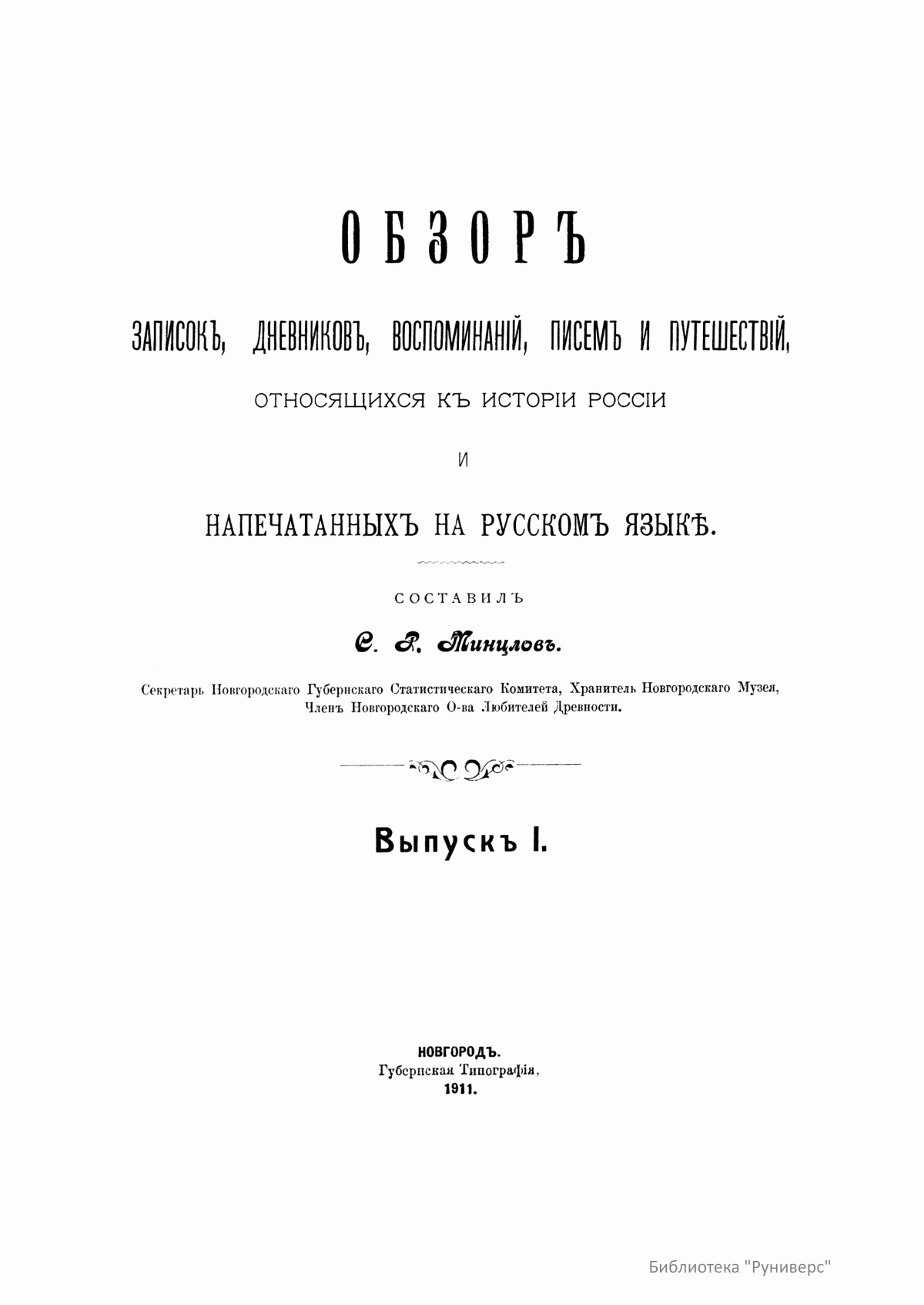 Историк-библиограф, археолог, писатель Сергей Рудольфович Минцлов (1870–1933) — крупный авторитет в области изучения и собирания старой русской книги. В 1911–1912 гг. он выпустил в свет «Обзор записок, дневников, воспоминаний, писем и путешествий, относящихся к истории России и напечатанных на русском языке». Этот библиографический указатель, включающий в себя более 5000 названий, стал результатом многолетнего труда. Минцлов просмотрел все основные библиографические пособия, каталоги букинистов-антикваров, журналы, епархиальные и губернские ведомости. Кроме того, был также использован ряд наиболее важных исторических сборников («Сборник Русского исторического общества», «Кавказский сборник», «Щукинские сборники», «Архив князя Воронцова», «Архив князя Куракина» и др.). В указателе учтено большое число различных дипломатических донесений, не относящихся к мемуарному жанру.