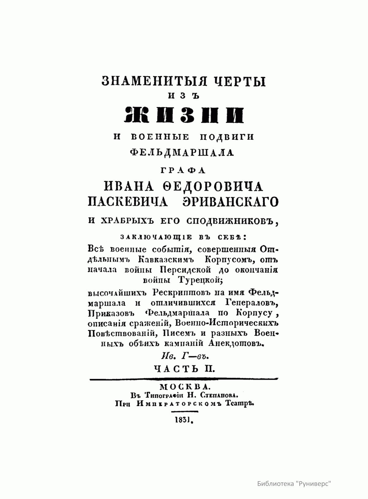 Знаменитые черты из жизни и военные подвиги фельдмаршала графа Ивана Федоровича Паскевича-Эриванского. Часть II