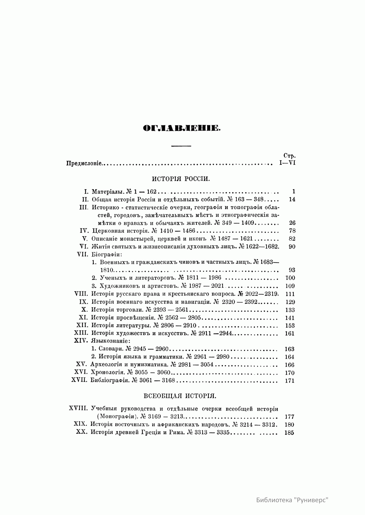 В десяти томах «Русской исторической библиографии» заключается описание свыше 44 000 книг, карт, периодических изданий, статей из журналов и газет по русской и всеобщей истории. Кроме этого, богато представлена литература о Крымской войне 1853–1856 гг., реформе 1860-х гг., польском восстании 1863–1864 гг. и о других событиях.
