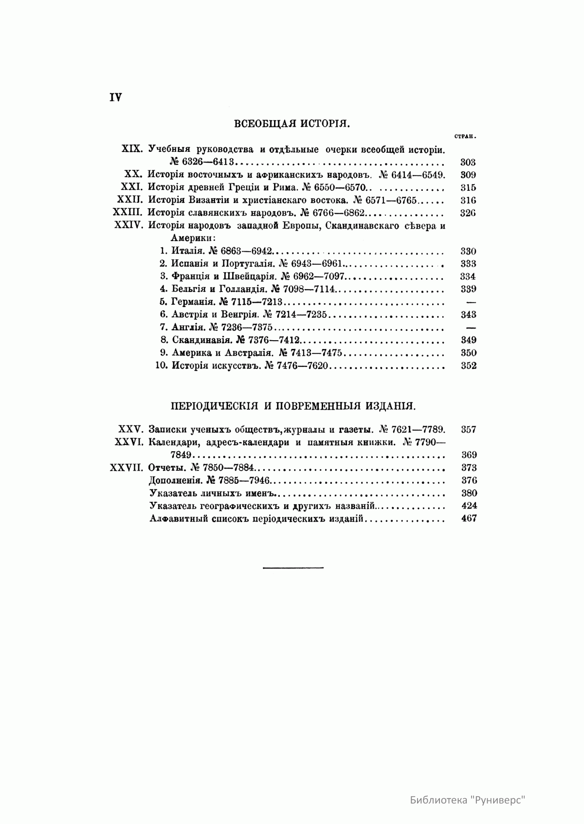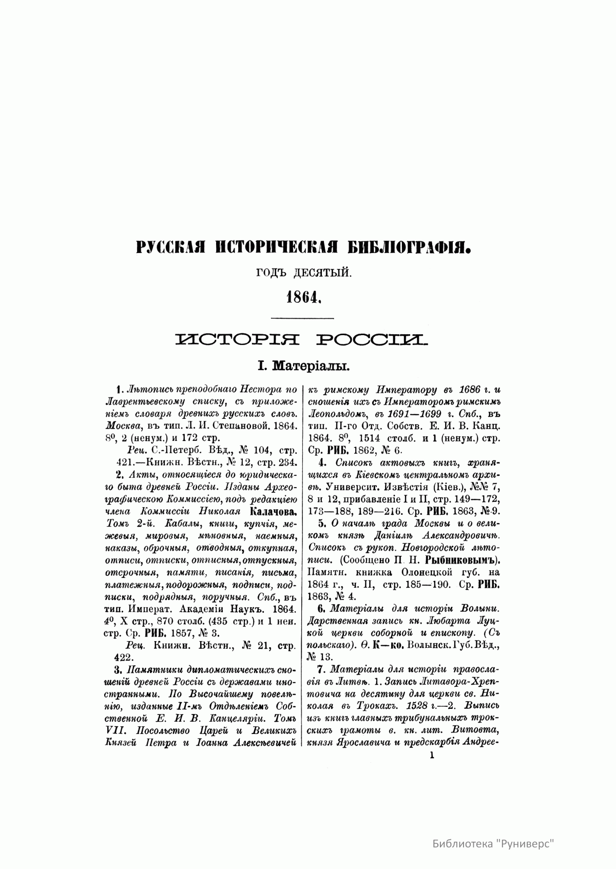 В десяти томах «Русской исторической библиографии» заключается описание свыше 44 000 книг, карт, периодических изданий, статей из журналов и газет по русской и всеобщей истории. Кроме этого, богато представлена литература о Крымской войне 1853–1856 гг., реформе 1860-х гг., польском восстании 1863–1864 гг. и о других событиях.