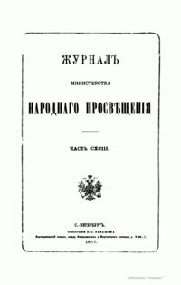 Журнал Министерства народного просвещения выходил с 1834-го по 1917 год. Официальный периодический журнал об успехах просвещения в России. Издатели журнала уверены в том, что «если для каждого человека необходим выход из грубой тьмы невежества и беспрерывное дальнейшее движение к свету, то для народов необходимо попечительное участие правительства в образовании. Только правительство имеет все средства знать и высоту успехов всемирного образования, и настоящие нужды Отечества».