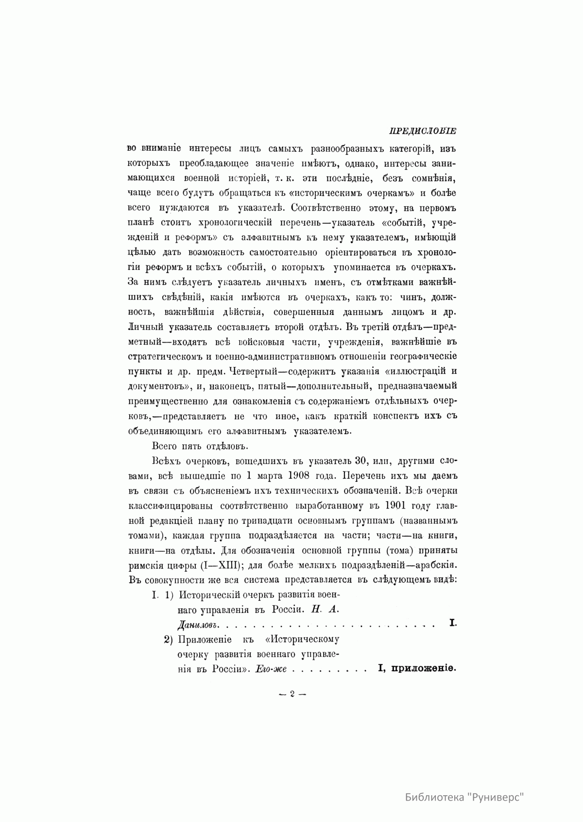 В исторических очерках в память столетия военного министерства содержится богатый материал, относящийся ко всем областям военного искусства и военной истории. Цель настоящего «Систематического указателя к историческим очеркам» облегчить читателю пользование этим юбилейным изданием. Указатель имеет и самостоятельное значение, так как дает хронологический обзор всех встречающихся в очерках реформ и событий. Указатель адресован прежде всего занимающимся военной историей, поэтому хронологический перечень – указатель «событий, учреждений и реформ» – стоит на первом плане. За ним следует указатель личных имен (второй отдел) с отметками важнейших сведений, которые имеются в очерках, как-то: чин, должность, важнейшие действия, совершенные данным лицом и пр. В третий отдел, предметный, входят все войсковые части, учреждения, важнейшие в стратегическом и военно-административном отношении географические пункты и другие предметы. Четвертый содержит указания иллюстраций и документов. Пятый представляет собой краткий конспект очерков. Вся система представлена в таблице, опубликованной во вступлении (выпуск первый, книга первая).