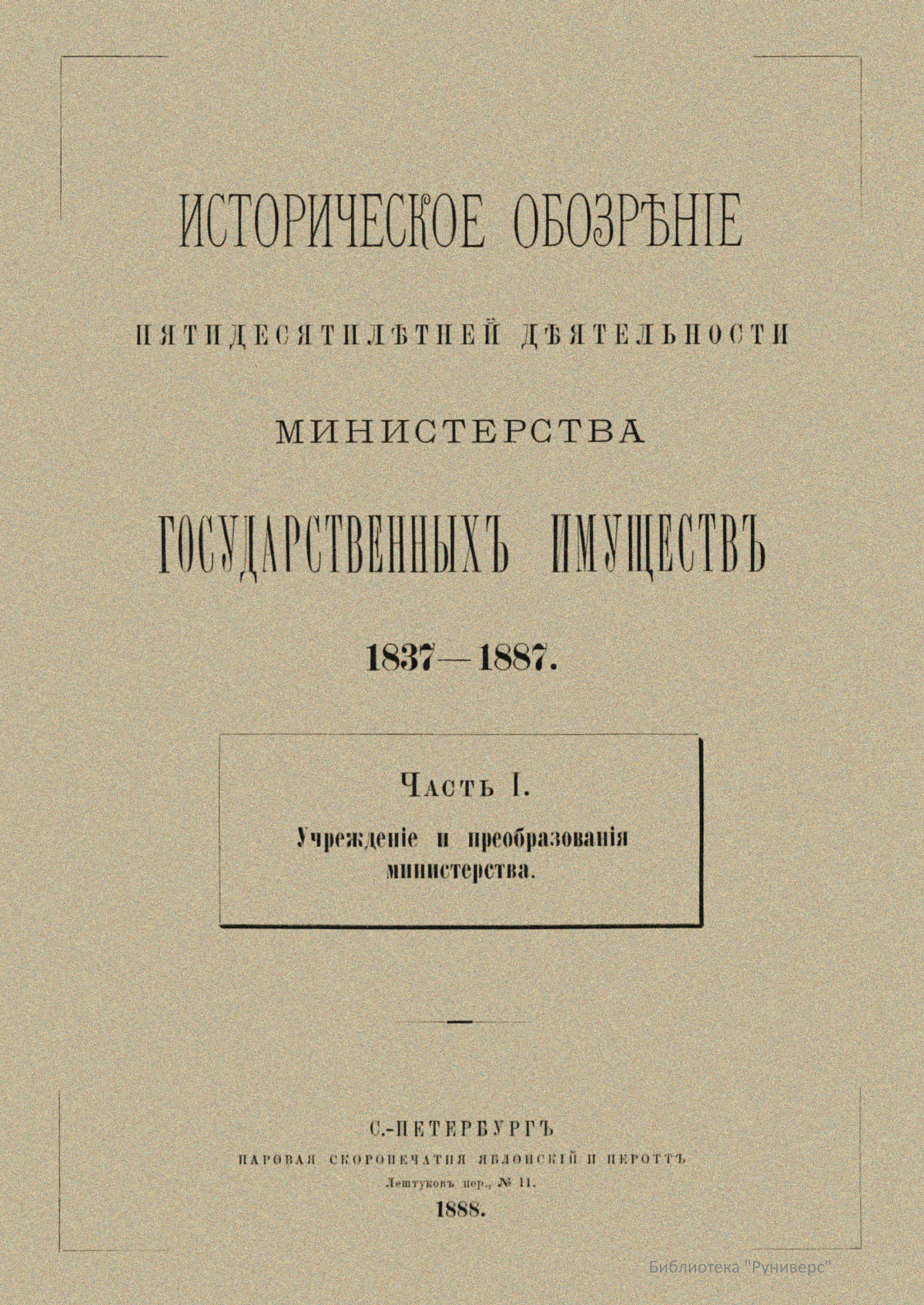 Историческое обозрѣнiе пятидесятилѣтней дѣятельности министерства государственныхъ имуществъ. 1837-1887
