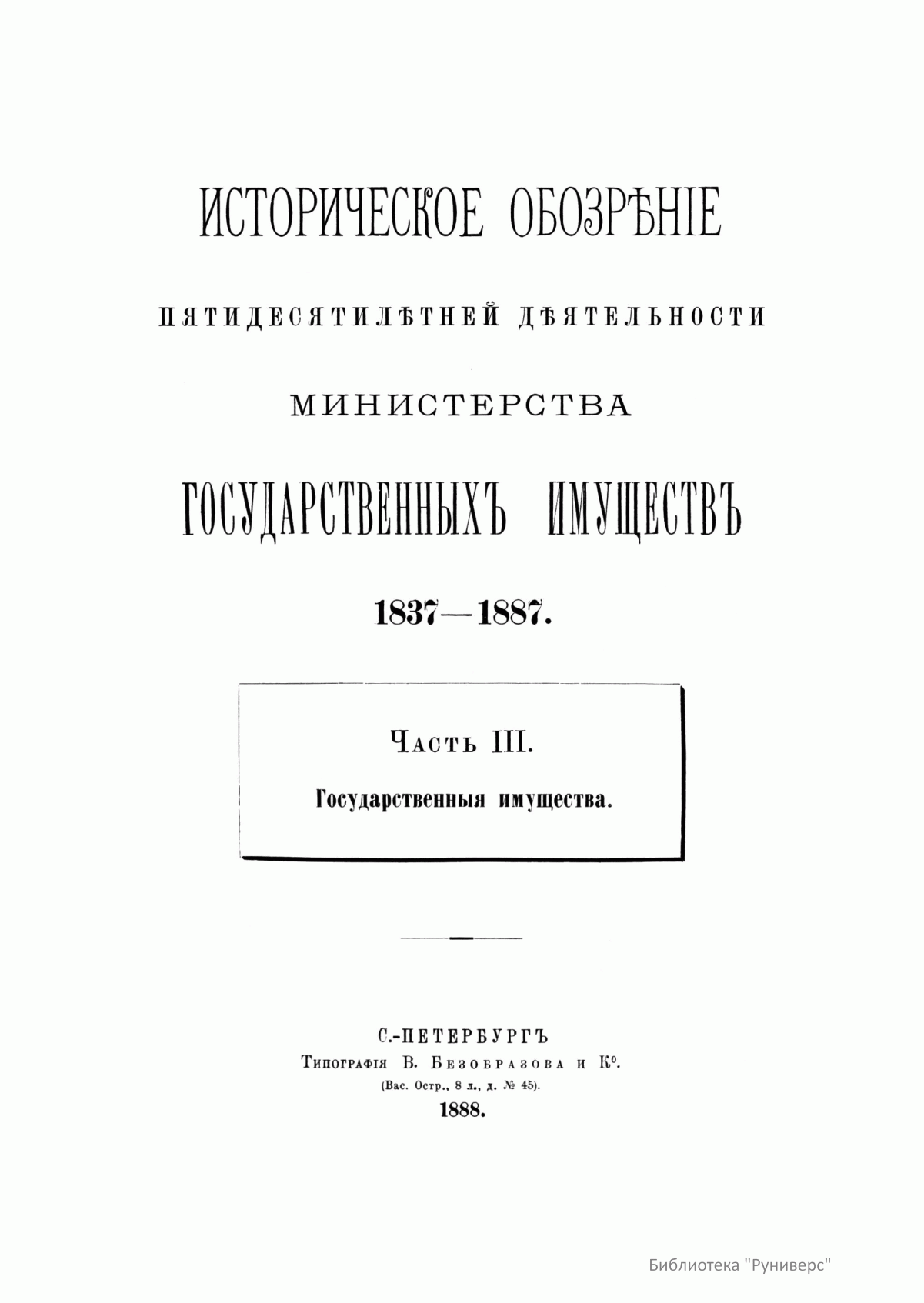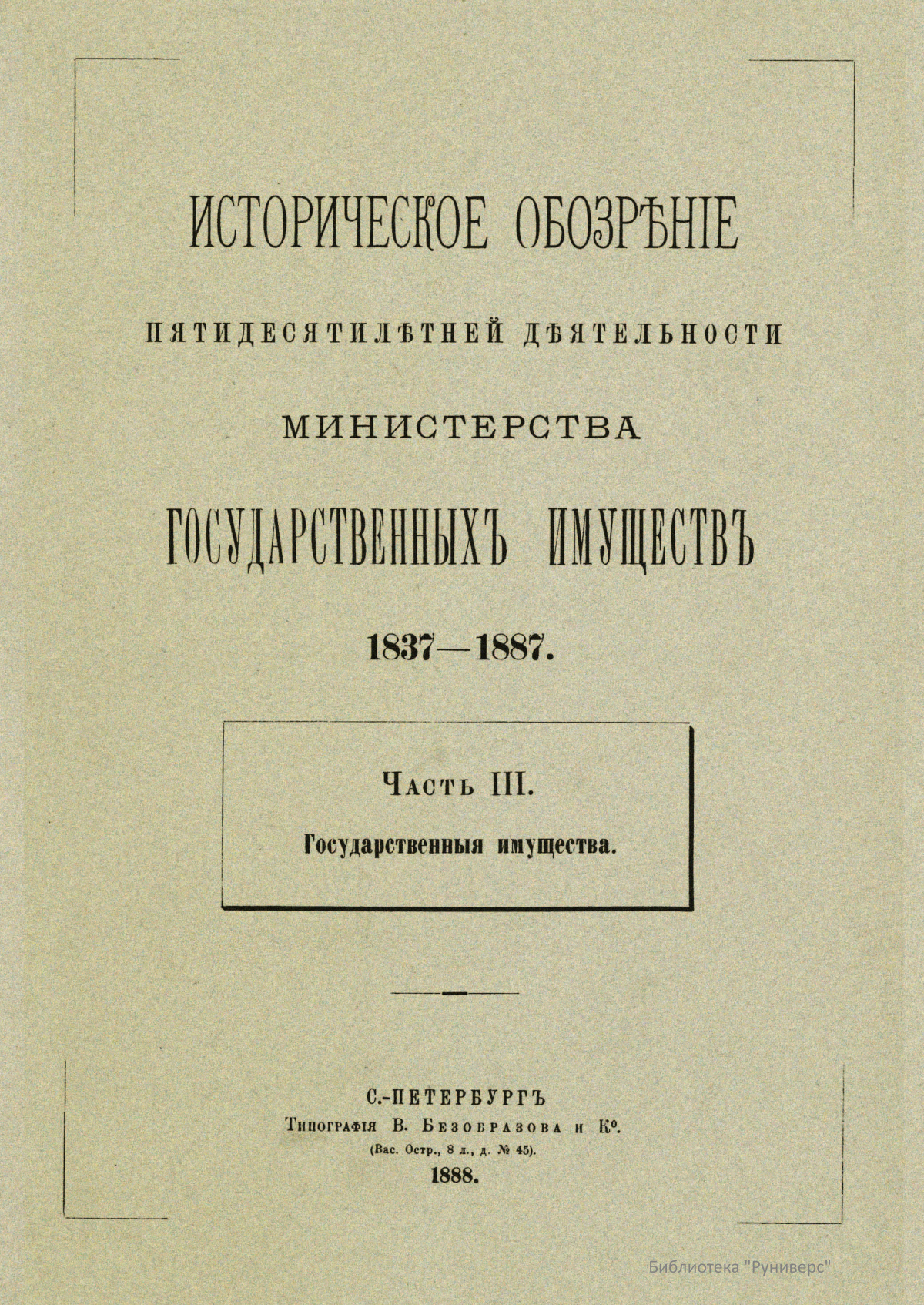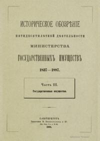 Историческое обозрѣнiе пятидесятилѣтней дѣятельности министерства государственныхъ имуществъ. 1837-1887. Часть III. Государственныя имущества