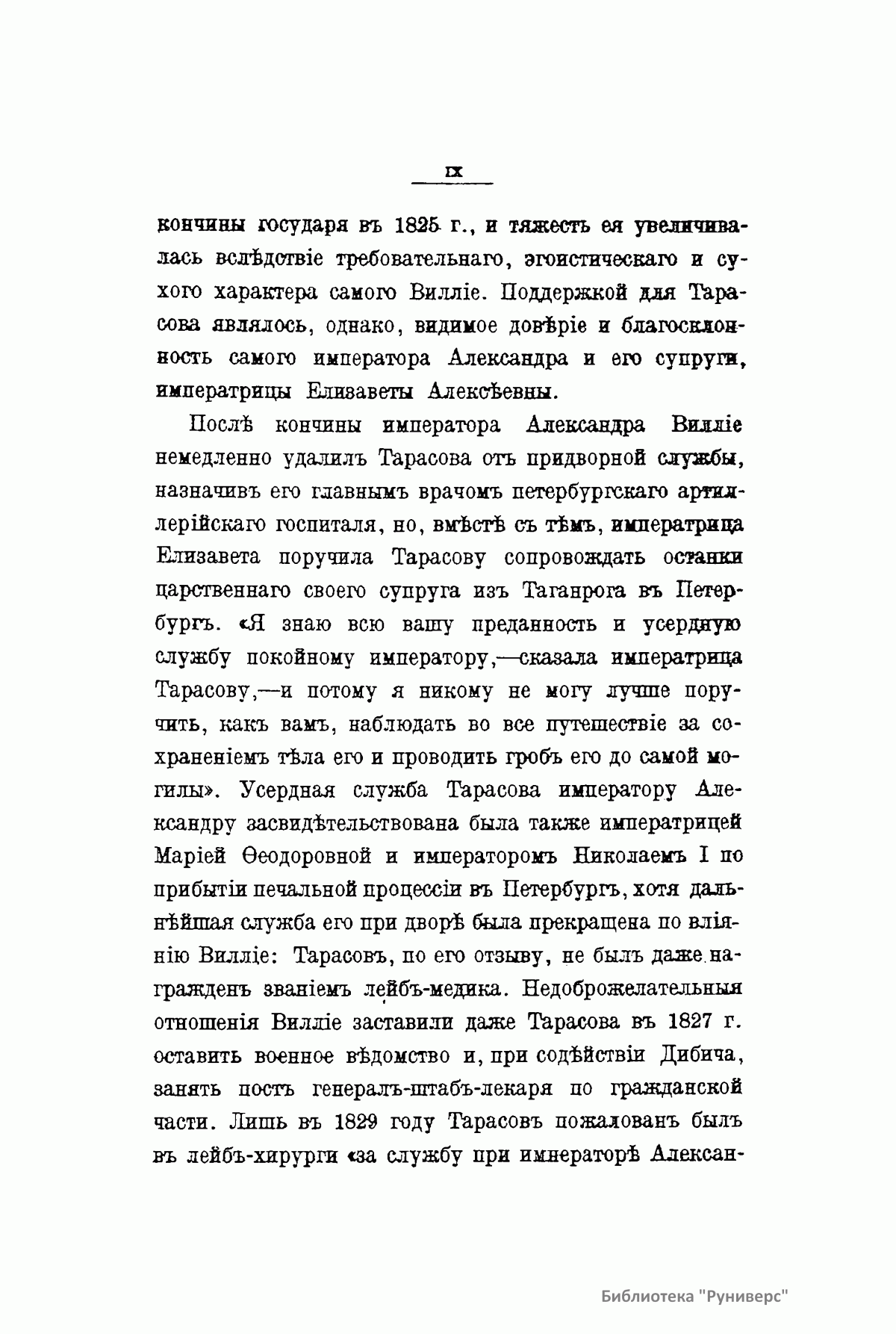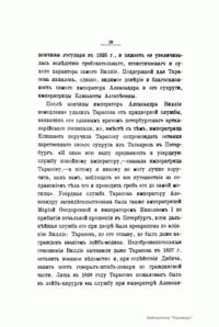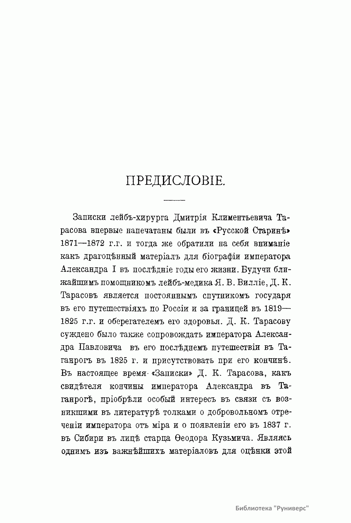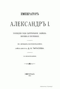 Записки лейб-хирурга Дмитрия Климентьевича Тарасова являются ценным источником для биографии Александра I в последние годы его жизни. Тарасов был постоянным спутником государя в его путешествиях по России и за границей в 1819 – 1825 гг. Он также сопровождал Александра в его последнем путешествии в Таганрог в 1825 г. и присутствовал при его кончине. Существует обширная литература о добровольном отречении Александра I от мира и появлении его в 1837 г. в Сибири в лице старца Федора Козьмича. Записки Тарасова являются важнейшим историческим материалом для оценки этой легенды. Настоящее издание (1915) представляет собой полную и точную перепечатку со списка М.И. Семевского, изданного в «Русской старине» в 1871 – 1872 гг.