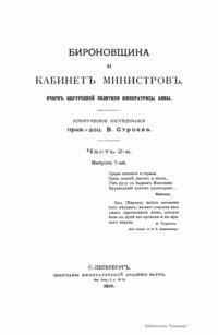 Эрнест-Иоанн Бирон (1690 – 1772), граф, фаворит императрицы Анны Иоанновны, герцог Курляндский (с 1737). Играл роль верховного владыки во все царствование императрицы (1730 – 1740). После ее смерти был несколько недель регентом за малолетством только что родившегося Иоанна Антоновича, объявленного императором Российской империи. После дворцового переворота в 1740 г. арестован и сослан. Помилован и возвращен в Петербург императором Петром III. Время правления Бирона заклеймено в истории именем «Бироновщина». Почти все современники Бирона и большинство позднейших историков считали время Анны Иоанновны вследствие господства Бирона самым бедственным временем для русского государства: засилье иностранцев, разграбление богатств страны, всеобщая подозрительность, шпионаж, доносы, жестокое преследование недовольных. Тем не менее, по словам автора настоящего издания В. Строева, «влияние Бирона нельзя назвать безусловно вредным». Автор в качестве эпиграфа использует слова А.С. Пушкина из письма к Лажечникову: «Он (Бирон) имел несчастие быть немцем. На него свалили весь ужас царствования Анны, которое было в духе его времени и в нравах народа». Историческое исследование В. Строева посвящено подробному анализу внутренней политики Анны Иоанновны. Автор доказывает, что кабинет министров до 1735 г. резко отличается от этого учреждения после 1735 г. Первая часть издания освещает события с 1730-го по 1735 г. Вторая часть посвящена кабинету министров после 1735 г.