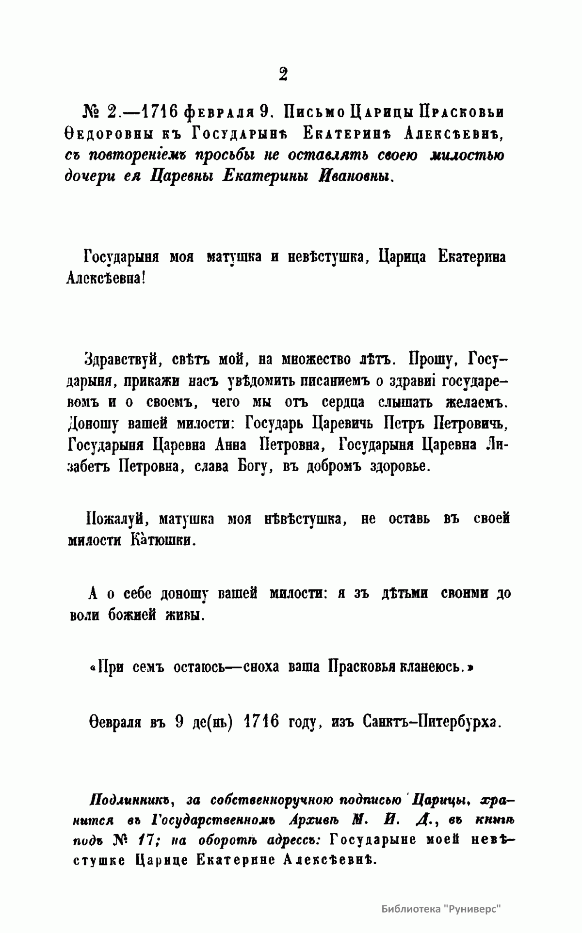 Письма русских государей и других особ царского семейства. II. Переписка царицы Прасковьи Федоровны и дочерей ее Екатерины и Прасковьи