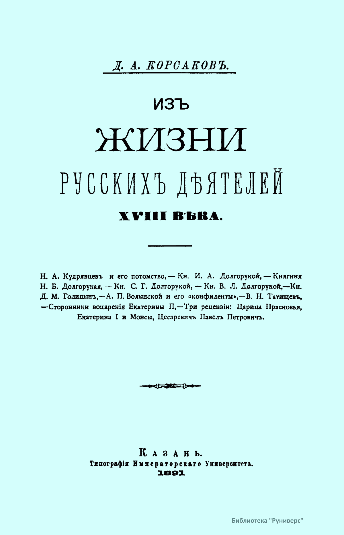 Биографические очерки и эпизоды из жизни русских деятелей XVIII века относятся к периоду от кончины Петра Великого до воцарения Екатерины II – времени памятного знаменательной борьбой потомков старинной московской знати с немцами, все более и более оттеснявшими их от кормила государственного правления. Эта борьба составляет главное содержание большей части монографий, входящих в состав предлагаемого сборника. Вниманию читателя предлагаются следующие статьи: 1. Никита Алферович Кудрявцев и его потомство. 2. Князь Иван Алексеевич Долгорукой, фаворит и обер-камергер императора Петра II, (1708 – 1739). 3. Княгиня Наталья Борисовна Долгорукая, (1714 – 1771). 4. Князь Сергей Григорьевич Долгорукой и его семья в ссылке (их жизнь в Раненбурге с 1730-го по 1735 г.). 5. Ссылка князя Василия Лукича Долгорукаго в село Знаменское, (1730). 6. Суд над князем Дмитрием Михайловичем Голицыным, (1736 – 1737). 7. Артемий Петрович Волынской и его «конфиденты», (1689 – 1740). 8. Василий Никитич Татищев, (1686 – 1750). 9. Некоторые из сторонников воцарения Екатерины II, (1757 – 1762). 10. Три рецензии: 1. М. И. Семевский. Царица Прасковья. Спб., 1883. 2. М. И. Семевский. Царица Екатерина Алексеевна, Анна и Вилим Монс. Спб., 1884. 3. Д. Ф. Кобеко. Цесаревич Павел Петрович. Спб., 1883.