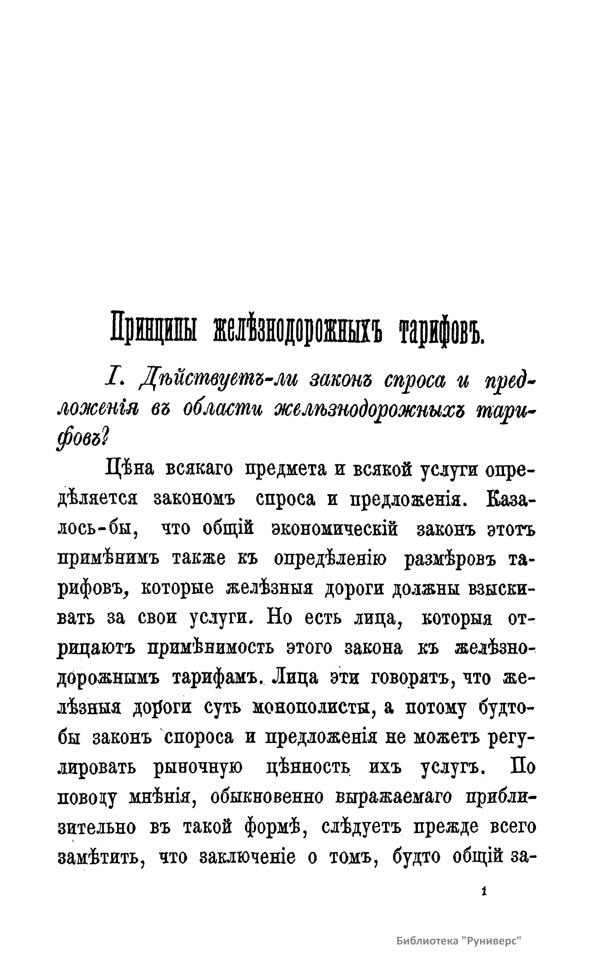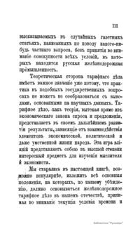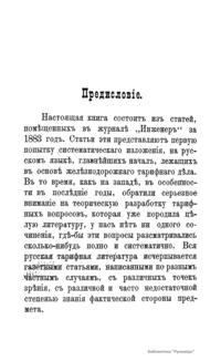 Настоящая книга состоит из статей, помещенных в журнале «Инженер» за 1883 г. Эти статьи представляют первую попытку систематического изложения на русском языке главнейших начал, лежащих в основе железнодорожного тарифного дела. Тарифное дело, вытекающее из всей совокупности экономических и торговых отношений и, в свою очередь, на них влияющее, имеет несомненный интерес как практического, так и теоретического характера. Только изучение и понимание тарифных вопросов во всей их полноте может предохранить учреждения, имеющие влияние на установление тарифов, от таких ошибок, которые должны отозваться значительными убытками или для народа, или для железных дорог, а следовательно, в огромном большинстве случаев и для государственного бюджета. Теоретическая сторона тарифного дела имеет важное значение потому, что практика в подобных государственных вопросах не может не сообразовываться с выводами, основанными на научных данных. Тарифное дело как теория, вытекая прямо из экономического закона спроса и предложения, представляет в своем дальнейшем развитии результаты, зависящие от взаимодействия элементов экономической, политической и даже умственной жизни народа. Эта игра влияний представляет собой в высшей степени интересный предмет для изучений мыслителя и экономиста.