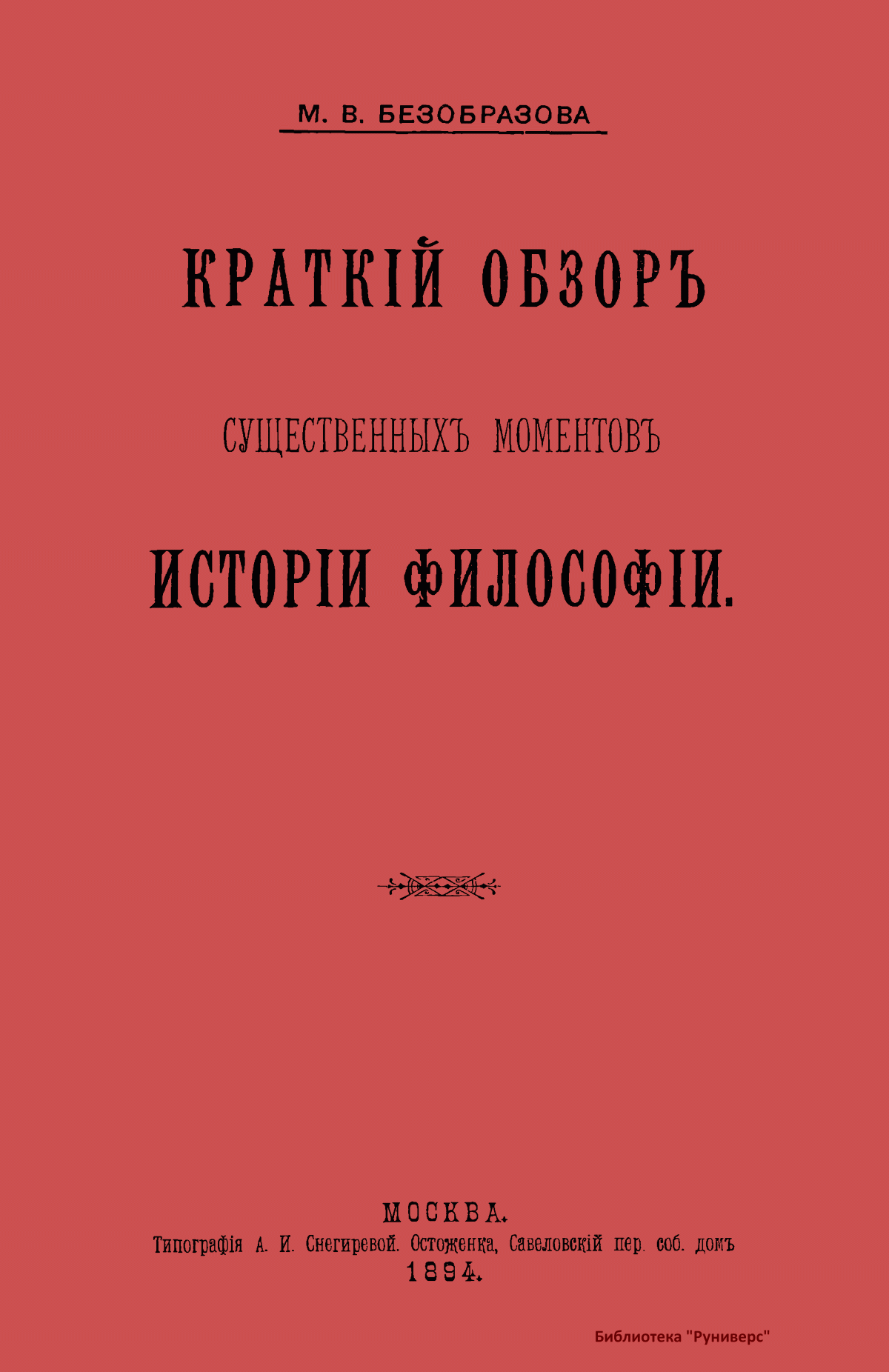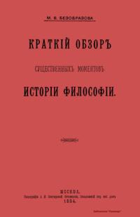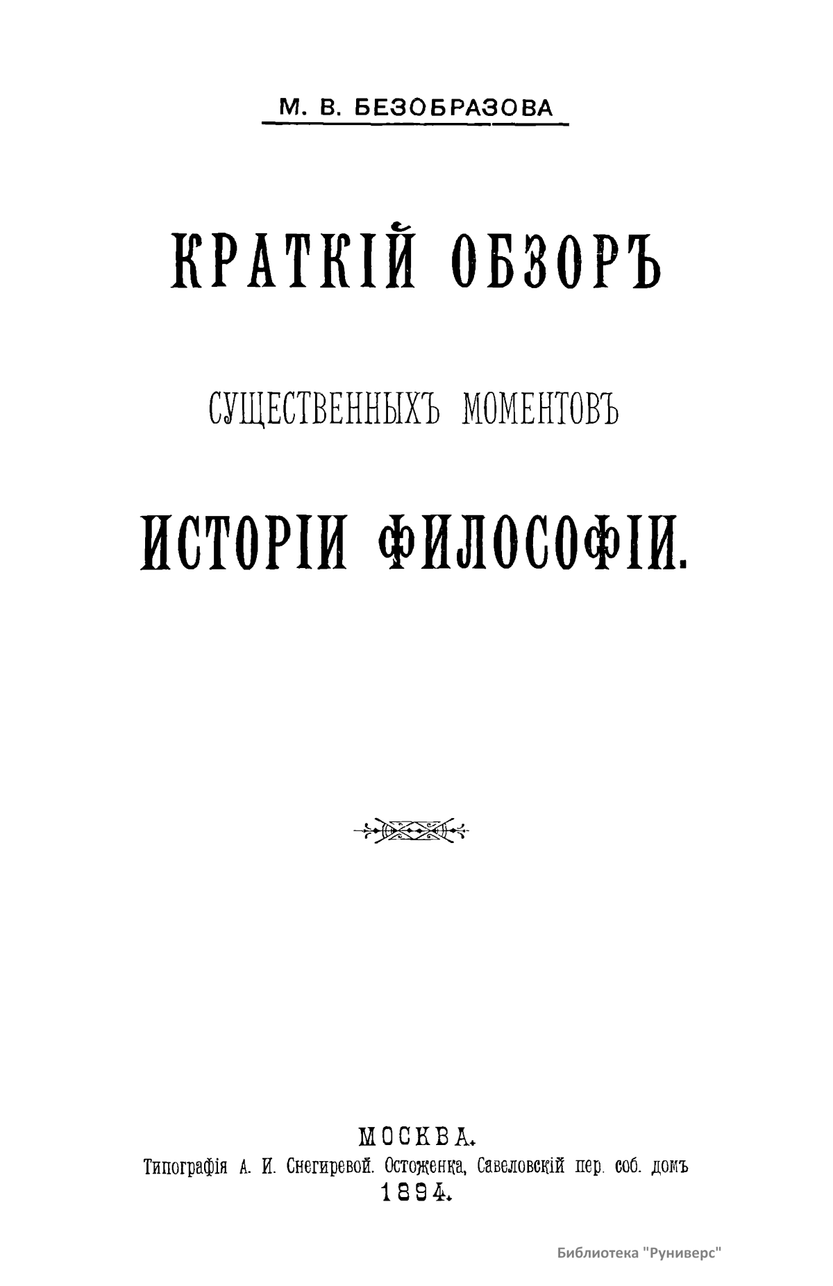 Автор ставит целью сформировать понятие о некоторых существенных, с его точки зрения, чертах истории философии, для чего касается не только главных философских учений, но также и их основных характерных черт. Отражая авторские симпатии, обзор является не только фрагментарным, но и предварительным по замыслу. Автор предпринимает попытку обобщить системы философов Древней Греции, Средневековья и Эпохи Возрождения, и развивает мысль о том, что философию в обширном смысле слова надо назвать «наукой о духе», где «человек разлагается в ней на свои невидимые части». Рассматривая философию в таком аспекте, Безобразова включает в нее психологию, этику и логику, выражая надежду, что настоящие и будущие исследователи сделают еще немало открытий в данной области философского знания.