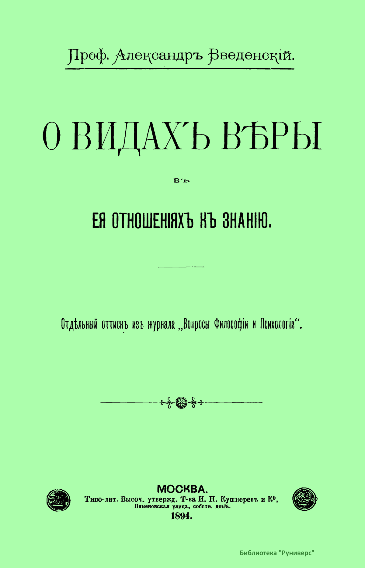 тот опубликовал статью "Вера и знание" (1893, кн.18). Введенский в ответной статье выступил с указанием и характеристикой различных видов веры, рассматриваемой со стороны её отношения к достоверному знанию. Он осуществляет анализ понятия веры и проводит различение между видами в их отношении к деятельности рассудка. Им выделяется наивная, слепая, суетная и сознательная веры. Введенский дает определение веры — это уверенность, исключающая состояние сомнения. Противоположное же вере состояние — это не неверие, а сомнение. Вера, критически рассмотренная и допущенная рассудком, не подвергается протесту с его стороны, так как не противоречит ни логике, ни фактам, тем самым эта вера оказывается неопровержимой, хотя и недоказуемой.