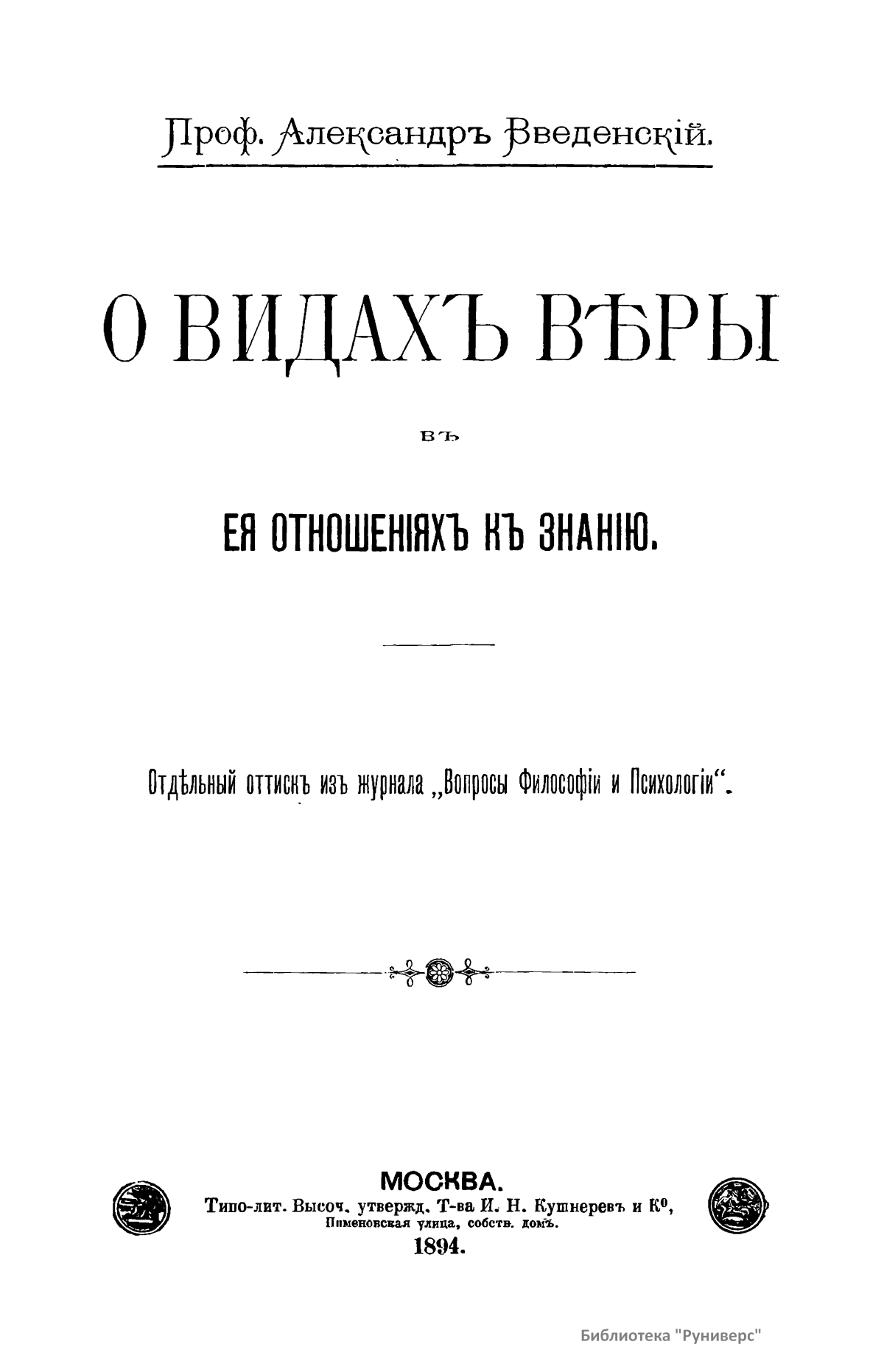 О видахъ вѣры въ ея отношенiяхъ къ знанiю