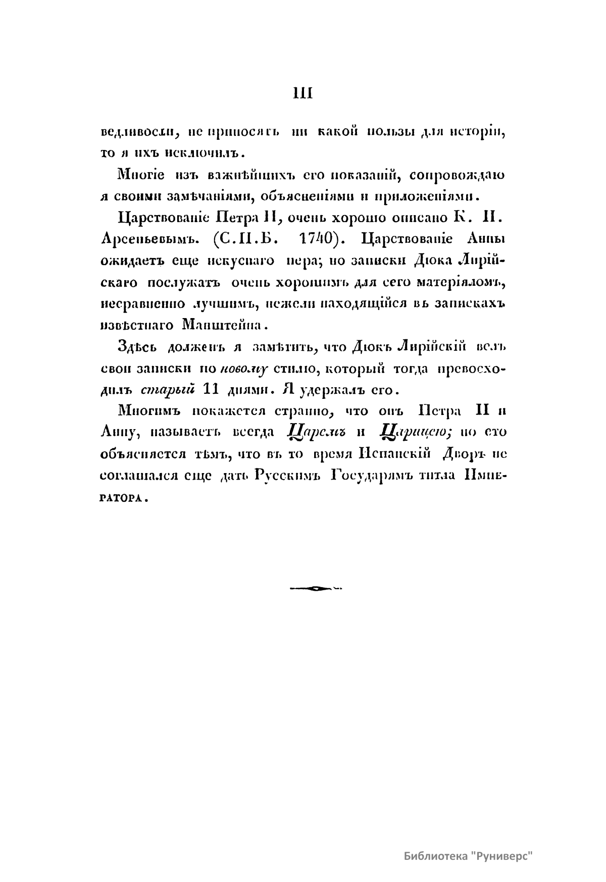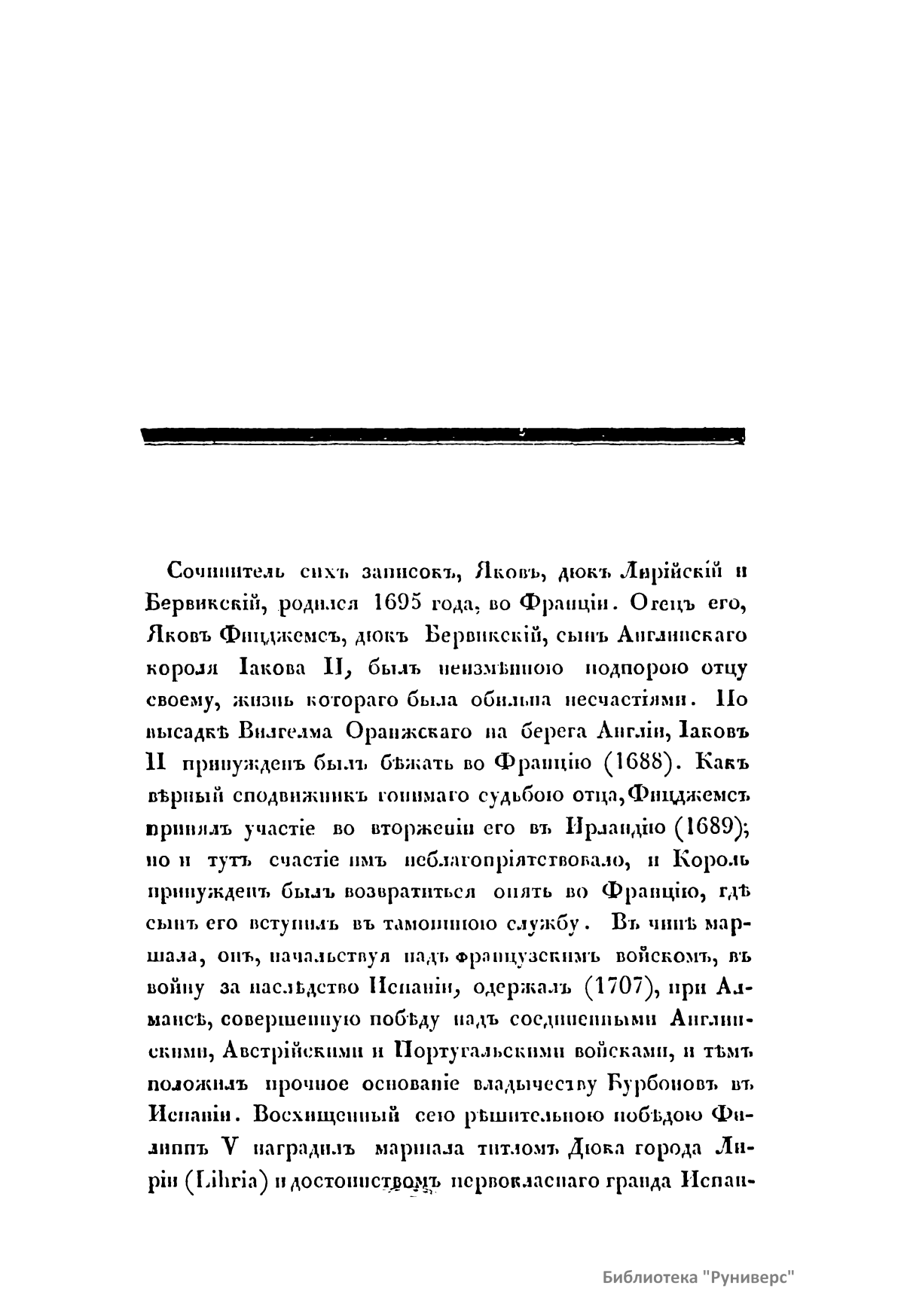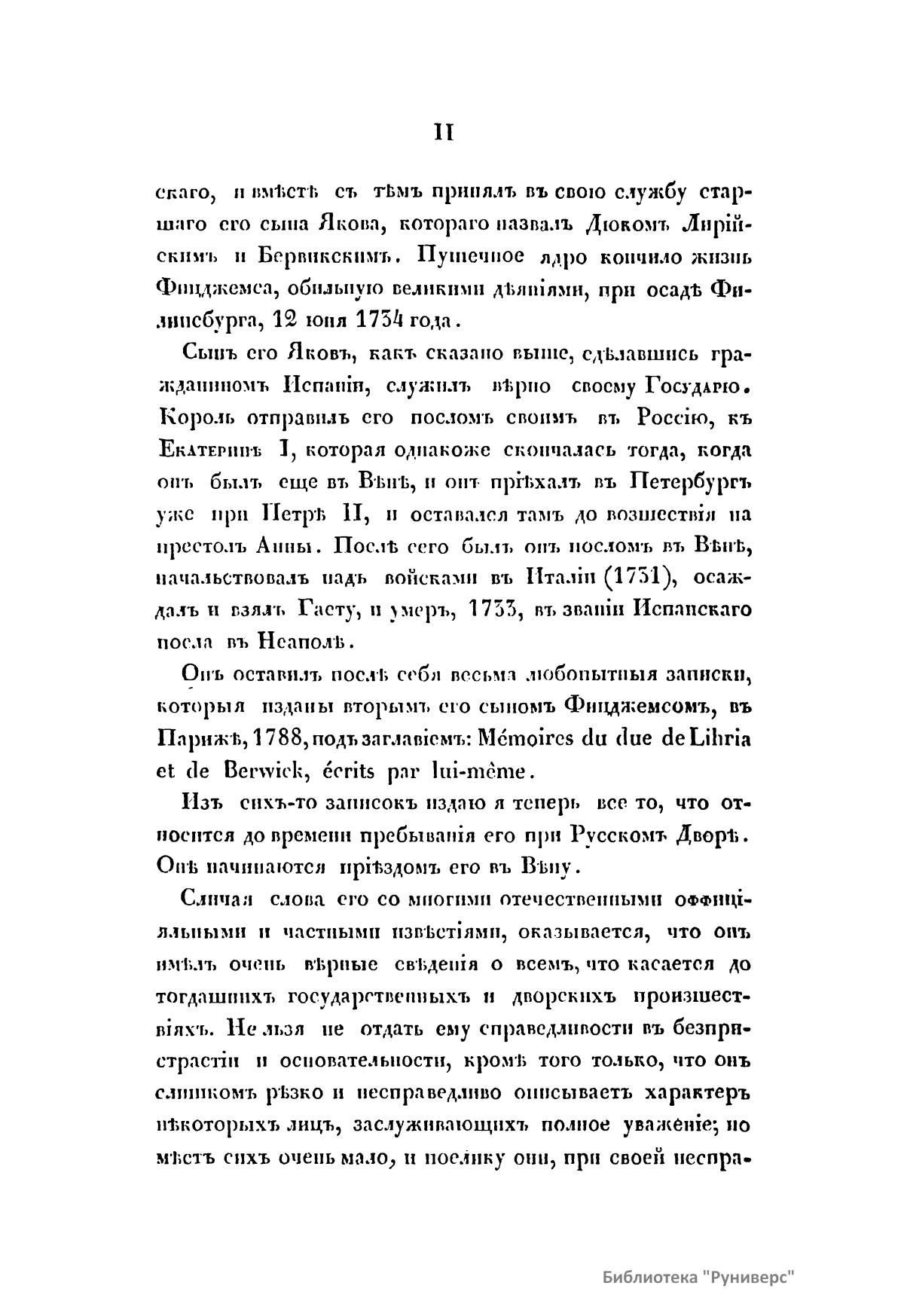 Автор настоящих записок Яков – дюк Лирийский и Бервикский родился в 1695 году во Франции. Отец его, Яков Фицджемс – дюк Бервикский, – сын английского короля Иакова II. После того как Вильгельм Оранжский высадился на берега Англии, Иаков II вынужден был бежать во Францию (1688). Верный сподвижник отца, Фицджемс принял участие в его неудачном вторжении в Ирландию (1689). Король возвратился опять во Францию. В чине маршала, возглавляя французское войско в войну за наследство Испании, он одержал (1707) при Алмансе совершенную победу над соединенными английскими, австрийскими и португальскими войсками и тем положил прочное основание владычеству Бурбонов в Испании. Восхищенный этой решительной победой, Филипп V наградил маршала титулом Дюка города Лирии и достоинством первоклассного гранда Испанского. Вместе с тем король принял на службу старшего сына Фицджемса Якова, которого назвал дюком Лирийским и Бервикским. Он отправил его своим послом в Россию к Екатерине I, но Яков приехал в Петербург уже при Петре II и оставался там до восшествия на престол Анны. Потом он был послом в Вене, начальствовал над войсками в Италии (1731), осаждал и взял Гаету и умер в 1733 году в звании Испанского посла в Неаполе. Оставил после себя записки, которые были изданы вторым его сыном Фицджемсом в Париже в 1788 году. Настоящее издание 1845 года представляет те места этих записок, которые относятся к пребыванию Якова при русском дворе. Нужно отдать справедливость автору в беспристрастности и основательности. Петра II и Анну он называет всегда царем и царицею. Это объясняется тем, что в то время испанский двор не соглашался дать русским государям титула императора.