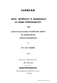 Записки Дюка Лирiйскаго и Бервикскаго во время пребыванiя его при императорскомъ россiйскомъ дворѣ въ званiи посла Короля Испанскаго. 1727-1730 годовъ