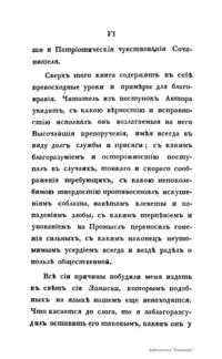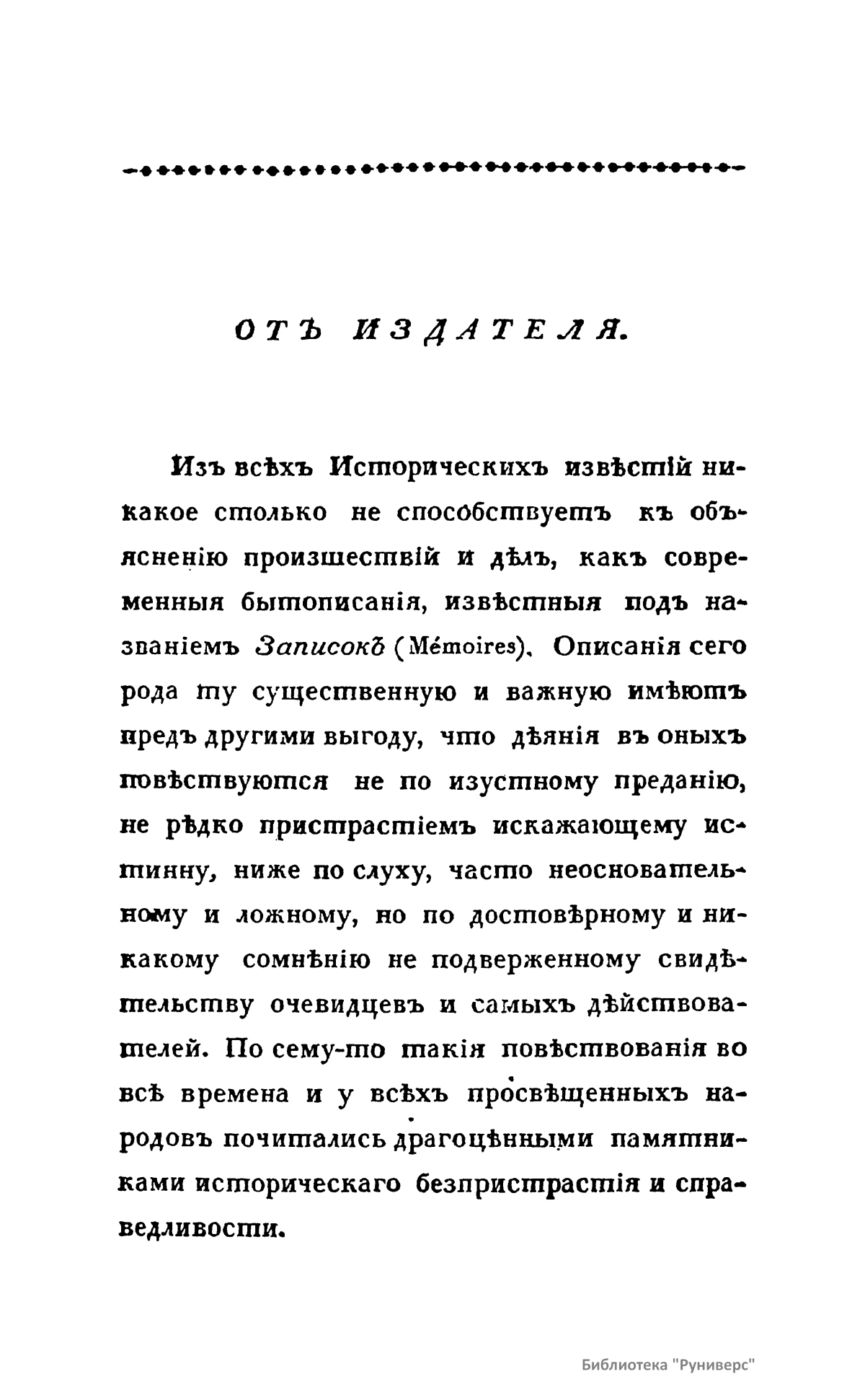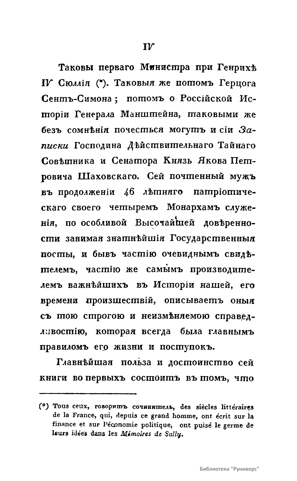Второе издание «Записок князя Якова Петровича Шаховского» (1705 – 1777) – полицмейстера при Бироне; обер-прокурора Св. Синода, генерал-прокурора и конференц-министра при Елизавете; сенатора при Екатерине II. Поэт Державин так характеризовал князя: Закону Божию послушен, Чувствителен, великодушен, Не горд, не подл и не труслив, К себе строжае, чем к другому, К поступкам хитрым не ревнив, Идет лишь по пути прямому. В издании нет оглавления и разделения на главы, что составляет неудобство для читателя, но оно содержит одно неоспоримое достоинство, о котором издатель сообщает: «…Что касается до слога, то я заблагорассудил оставить его таковым, каков у господина сочинителя, опасаясь, дабы перемена старинных и вышедших из употребления слов на выражения, ныне употребляемые, не уменьшила той исторической ясности, которую автор всегда соблюдать старался».