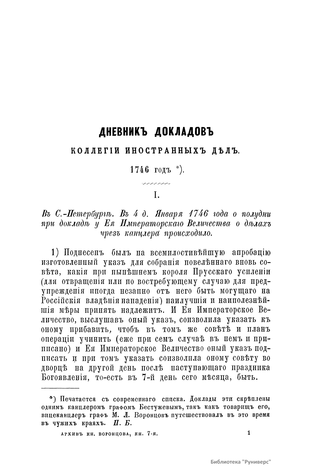 Издание представляет документы из архива графов (с 1845 г. князей) Воронцовых, крупных политических деятелей России XVIII и XIX вв.: Михаила Илларионовича (1714 – 1767) – канцлера при Елизавете Петровне; Романа Илларионовича (1707 – 1783); Александра Романовича (1741 – 1805) – канцлера в 1802 – 1804 гг.; Семена Романовича (1744 – 1832) – посла в Англии в 1785 – 1806 гг.; Михаила Семеновича (1782 – 1856) – фельдмаршала, наместника Кавказа в 1845 – 1853 гг. Архив издан в 40 тт. (1870 – 1895) под редакцией П. И. Бартенева. Содержит огромный материал по внешней политике, по управлению хозяйством Елизаветы Петровны (кн. 1), по делу Миниха и Бирона (кн. 2), о «чумном бунте» 1771 г. в Москве, о движении Е. И. Пугачева (кн. 16), о А. Н. Радищеве (кн. 5, 12, 24). Книга 21-я занята «Записками» Е. Р. Воронцовой (Дашковой). В книге 24-й – свыше 100 писем А. В. Суворова. Среди обширной переписки Воронцовых встречаются письма Вольтера, Д'Аламбера, Жозефа де Местра, Костюшки, Талейрана, Питта и др.