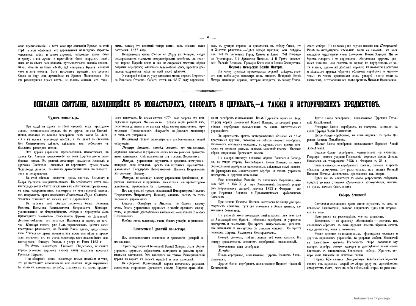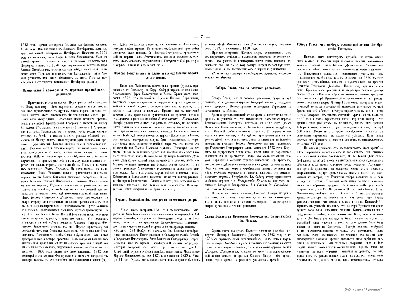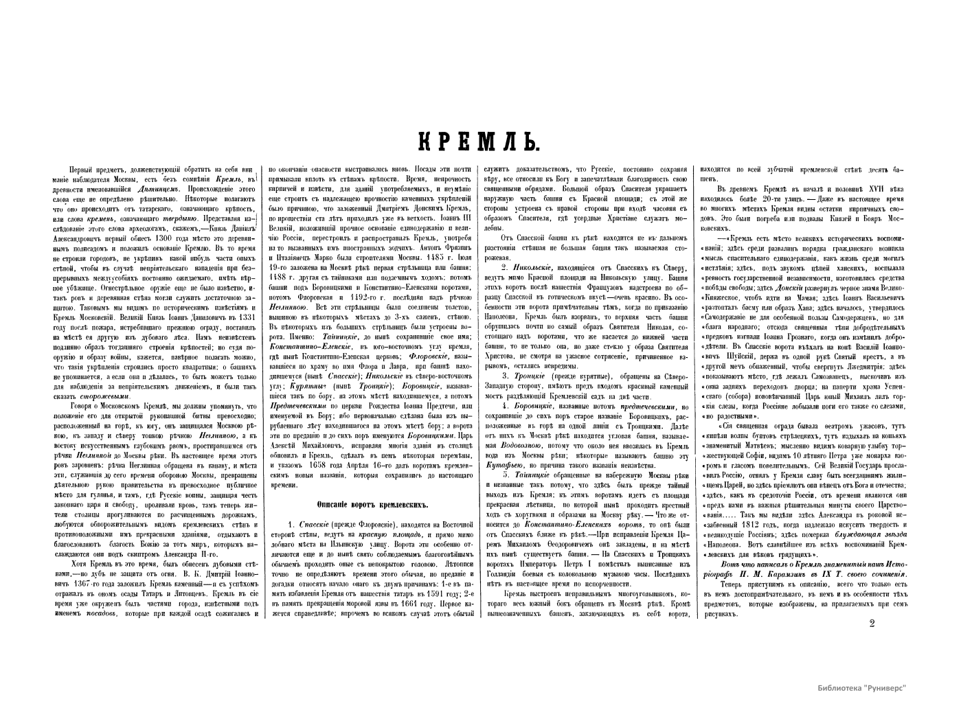 Издание включает историю Московского Кремля от начала основания до 60-х годов XIX века. Описание всех исторических памятников Кремля с указанием времени и причин их основания. Описание драгоценностей, редкостей, образов и других вещей, находящихся в кремлевских зданиях. Книга украшена десятью литографиями с видами Кремля и его окрестностей.