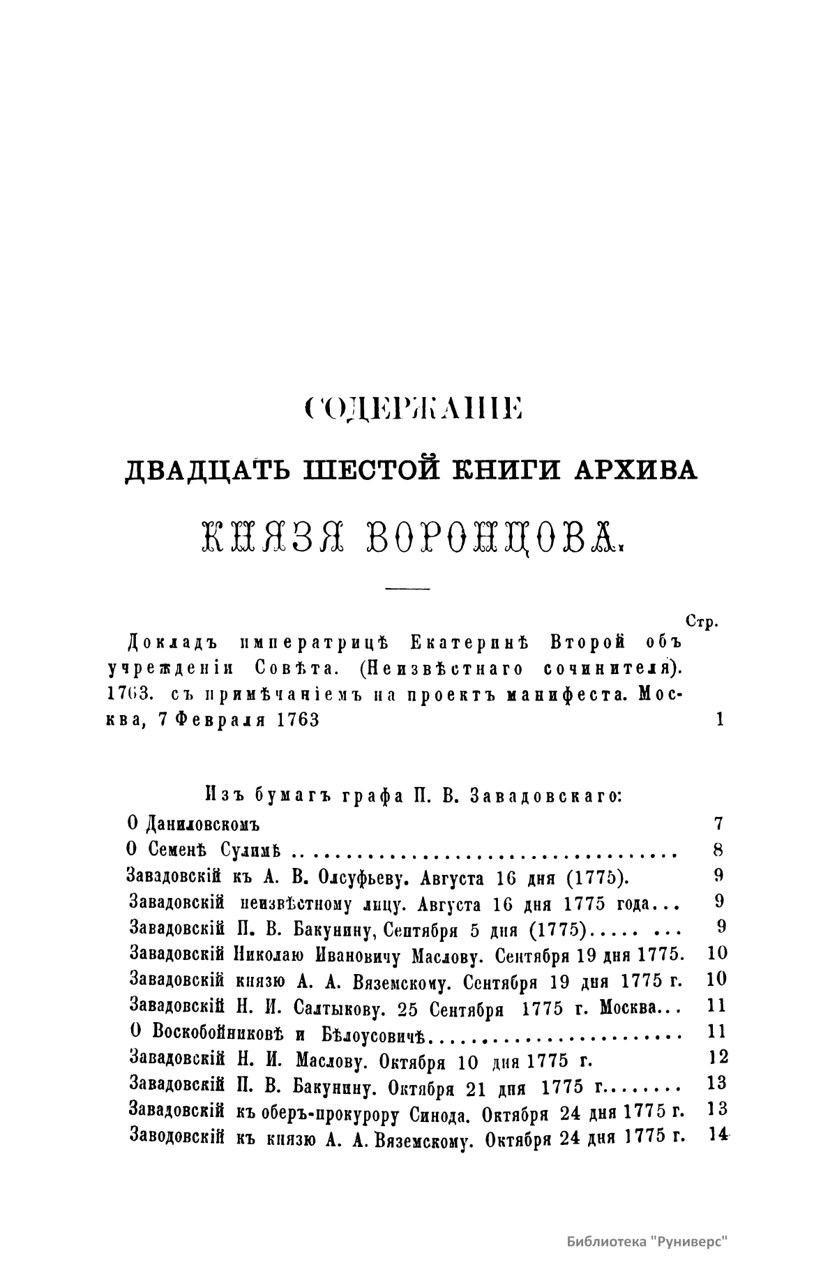 Издание представляет документы из архива графов (с 1845 г. князей) Воронцовых, крупных политических деятелей России XVIII и XIX вв.: Михаила Илларионовича (1714 – 1767) – канцлера при Елизавете Петровне; Романа Илларионовича (1707 – 1783); Александра Романовича (1741 – 1805) – канцлера в 1802 – 1804 гг.; Семена Романовича (1744 – 1832) – посла в Англии в 1785 – 1806 гг.; Михаила Семеновича (1782 – 1856) – фельдмаршала, наместника Кавказа в 1845 – 1853 гг. Архив издан в 40 тт. (1870 – 1895) под редакцией П. И. Бартенева. Содержит огромный материал по внешней политике, по управлению хозяйством Елизаветы Петровны (кн. 1), по делу Миниха и Бирона (кн. 2), о «чумном бунте» 1771 г. в Москве, о движении Е. И. Пугачева (кн. 16), о А. Н. Радищеве (кн. 5, 12, 24). Книга 21-я занята «Записками» Е. Р. Воронцовой (Дашковой). В книге 24-й – свыше 100 писем А. В. Суворова. Среди обширной переписки Воронцовых встречаются письма Вольтера, Д'Аламбера, Жозефа де Местра, Костюшки, Талейрана, Питта и др.