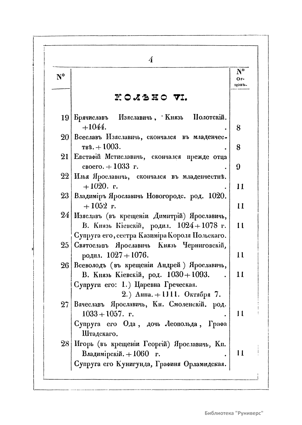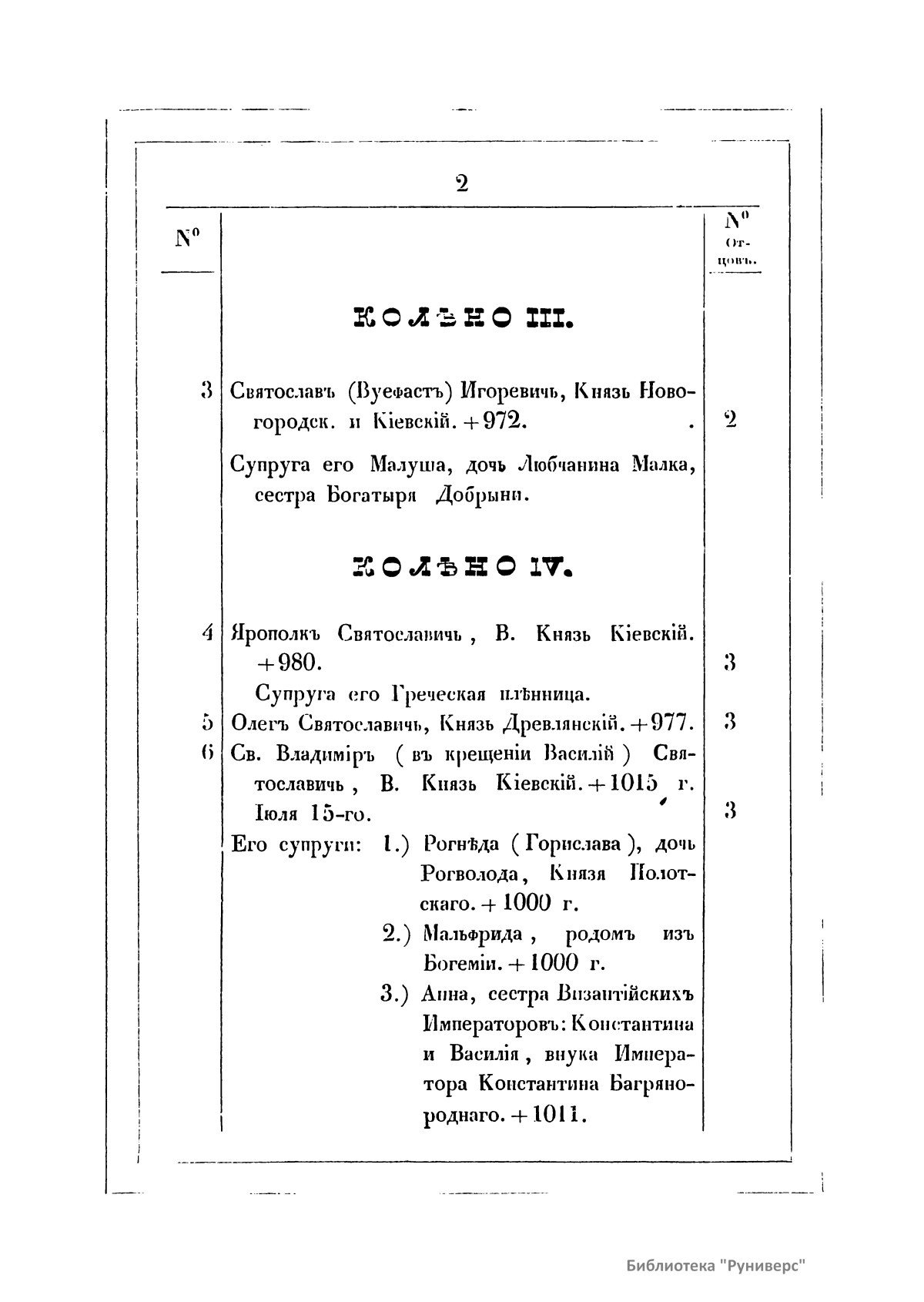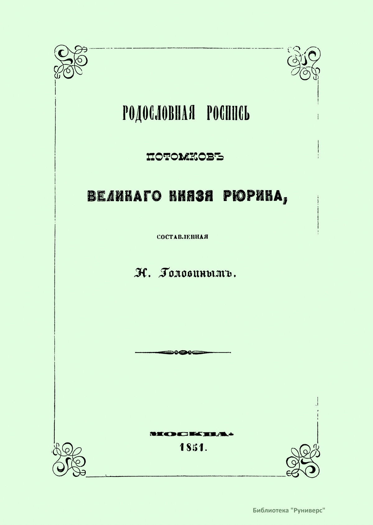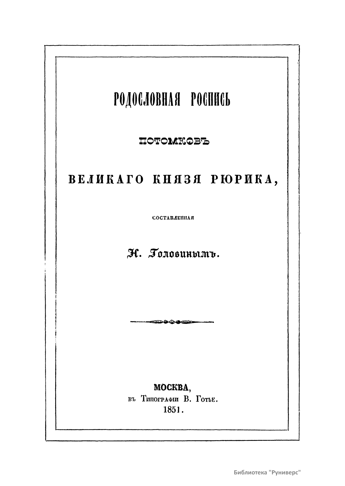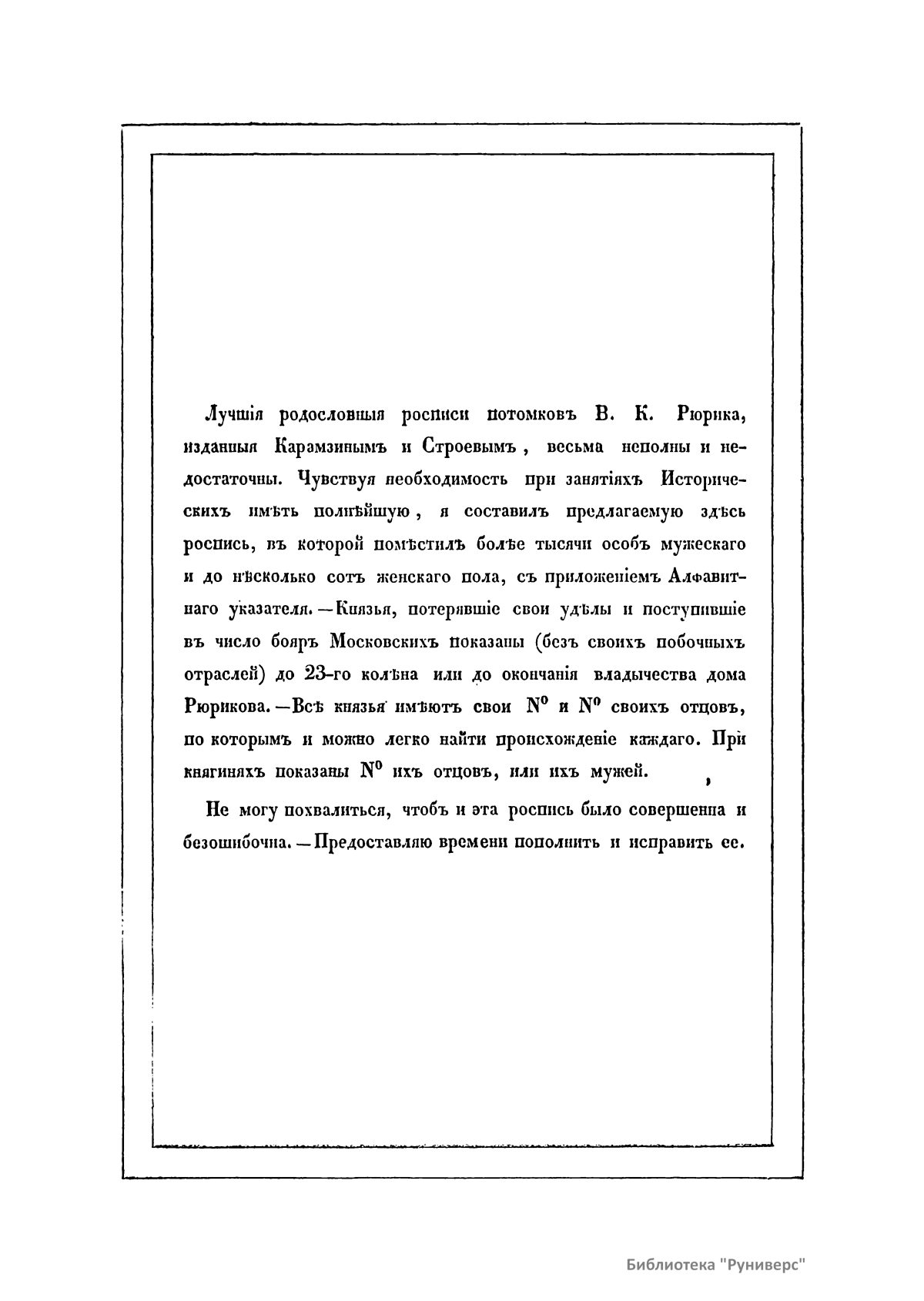 Рюрик – варяго-русс, первый князь Новгородский, основатель династии Рюриковичей. Правил с 862-го по 879 год. Согласно летописи, был призван ильменскими славянами вместе с братьями Синеусом и Трувором княжить в Новгороде. В предлагаемой родословной росписи потомков великого князя Рюрика автор поместил более тысячи особ мужского и несколько сот женского пола с приложением алфавитного указателя. Князья, потерявшие свои уделы и поступившие в число бояр Московских, показаны (без своих побочных отраслей) до 23-го колена, или до окончания владычества Дома Рюрикова. Все князья имеют свои номера и номера своих отцов, по которым легко можно найти происхождение каждого. При княгинях показаны номера их отцов или их мужей.