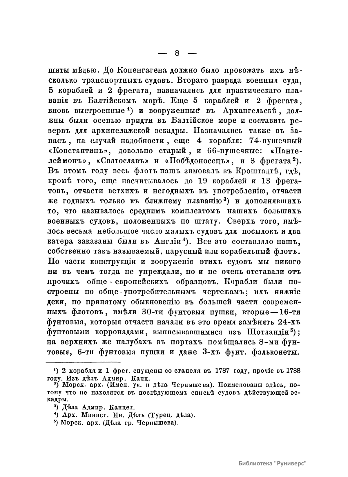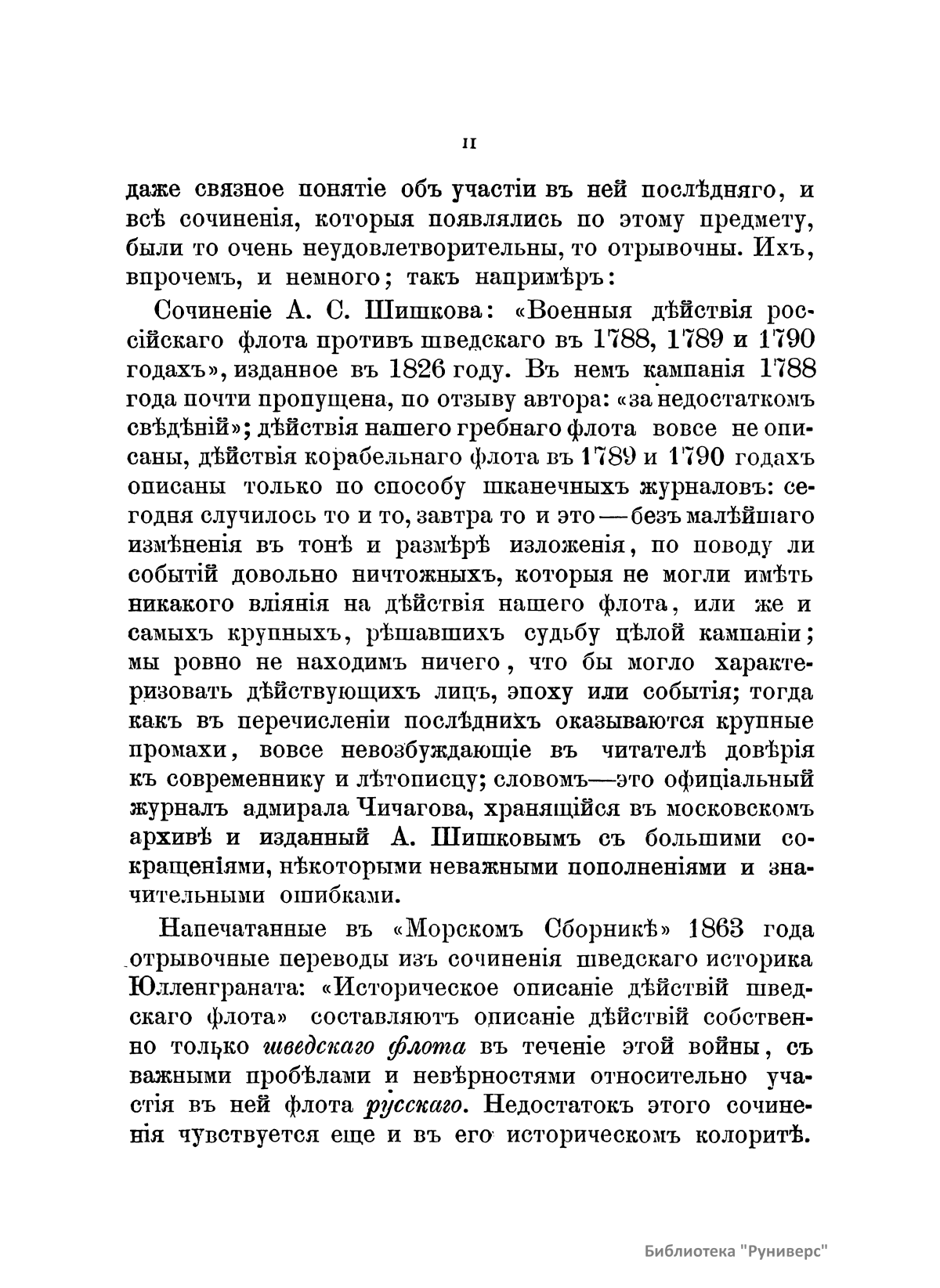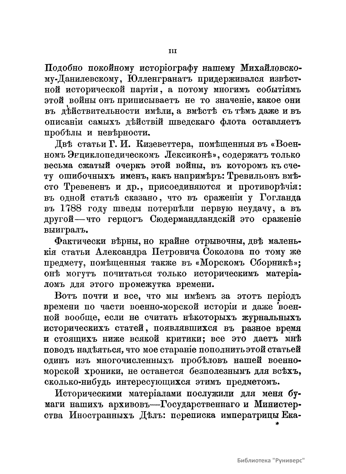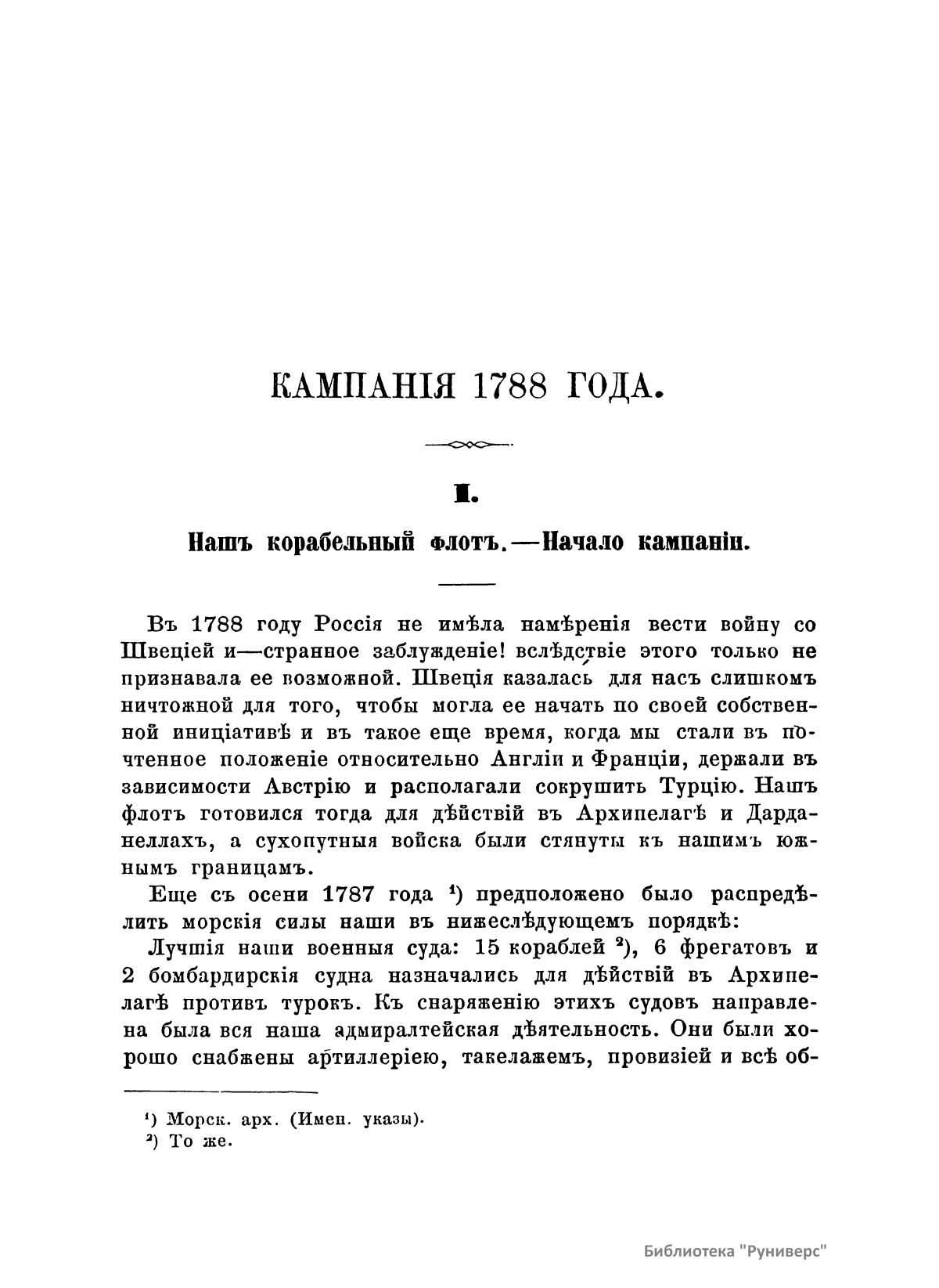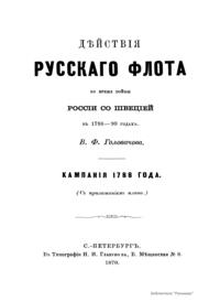 Русско-шведская война 1788 – 1790 гг. – попытка Швеции вернуть владения в Прибалтике. Русский флот победил в Гогландском (1788) и Выборгском (1790) сражениях. Шведы неудачно провели наступление в Финляндии. Война завершилась Верельским миром 1790 г. «Эта война отличалась многими боевыми подвигами с нашей стороны, тянулась три года, прославилась большими морскими сражениями и блестящим собранием наших даровитых моряков, каковы были: Грейг, Чичагов, фон-Круз, Козлянинов, Нассау-Зиген, Ханыков, Макаров, Кроун, Карцев и многие другие, – заставила нас потратить много усилий, денег и людей, взамен чего не доставила нам ровно никакого приобретения». Книга (с приложением плана) посвящена кампании 1788 г. Автор использовал документы Государственного архива и Архива министерства иностранных дел (переписка Екатерины II с разными лицами; переписка графа А.А. Безбородко с русскими дипломатическими агентами и предводителями отдельных частей войск); документы Морского архива (дела Адмиралтейской канцелярии, дела графа Чернышева, клеркские судовые протоколы – преимущественно шканечные журналы). Автор часто прибегает к подлинному тексту самих документов, так как это «живой современный разговор, часто незаменимый никаким красноречивым изложением историка».