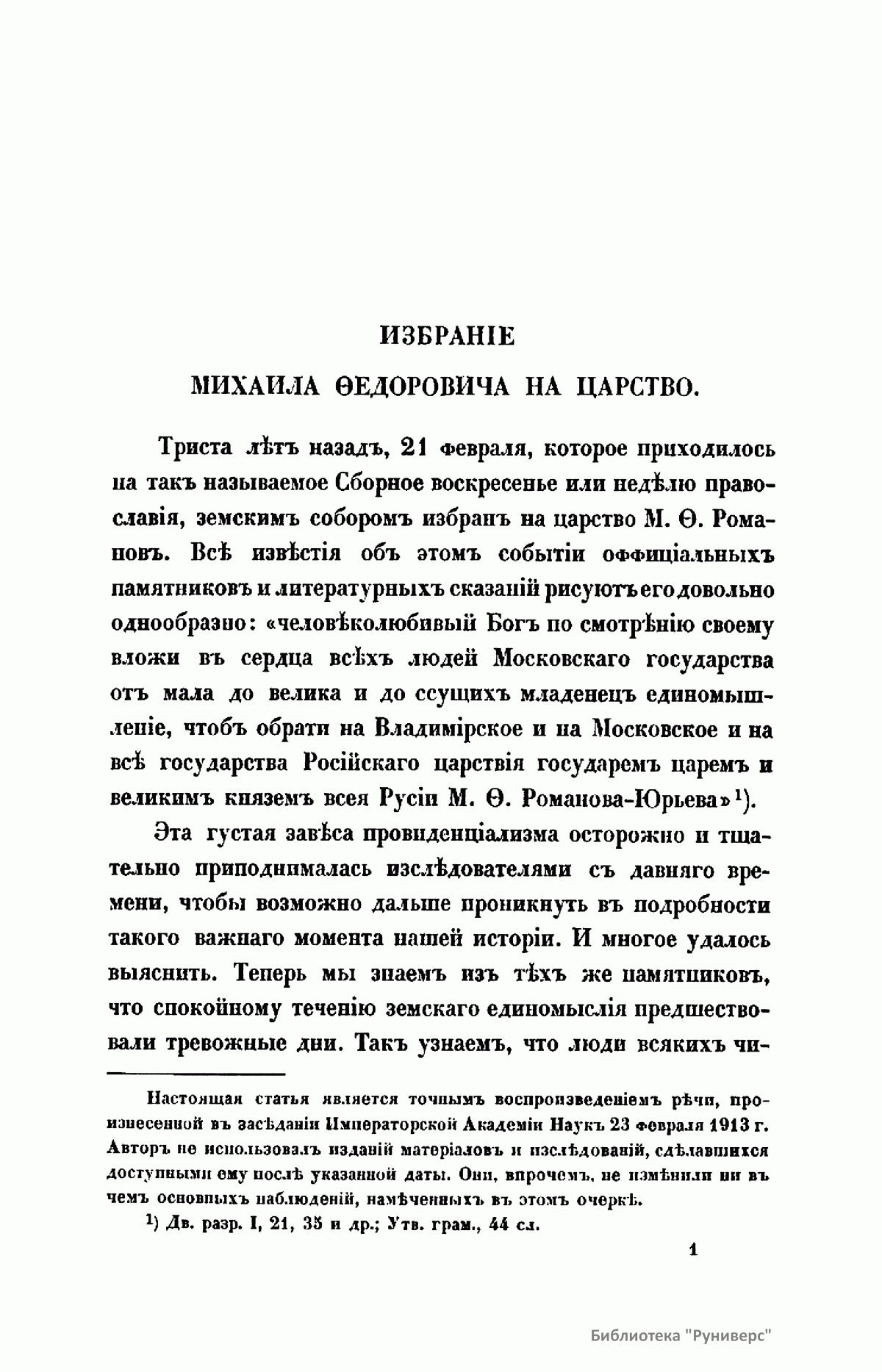 В настоящей брошюре автор рассматривает спорные и неопределенные факты исторических источников, касающиеся избрания Михаила Федоровича Романова на царство. Романовы – боярский род в России XIV – XVI вв., потомки выходца из Литвы Андрея Кобылы. До начала XVI в. именовались Кошкиными, до конца XVI в. – Захарьиными. С 1613 г. царская, с 1721 г. – императорская династия. Михаил Федорович, внучатый племянник царицы Анастасии Романовны, первой супруги Ивана Грозного, – первый царь из рода Романовых.