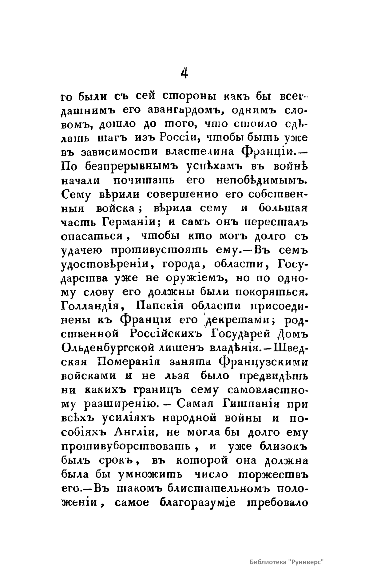 В книге описана освободительная война России против Наполеона Бонапарта. «Год сей пребудет незабвенным в позднейшем потомстве. К побиению орд Мамая, к поражению Карла под Полтавой история приобщит отныне сокрушение сил Наполеона. Россия, сражаясь с целою Европой, познала более, нежели в другое какое время, всю великость сил своих и способов и достигла в глазах целого света величайшей, никем не оспориваемой и неувядаемой славы».