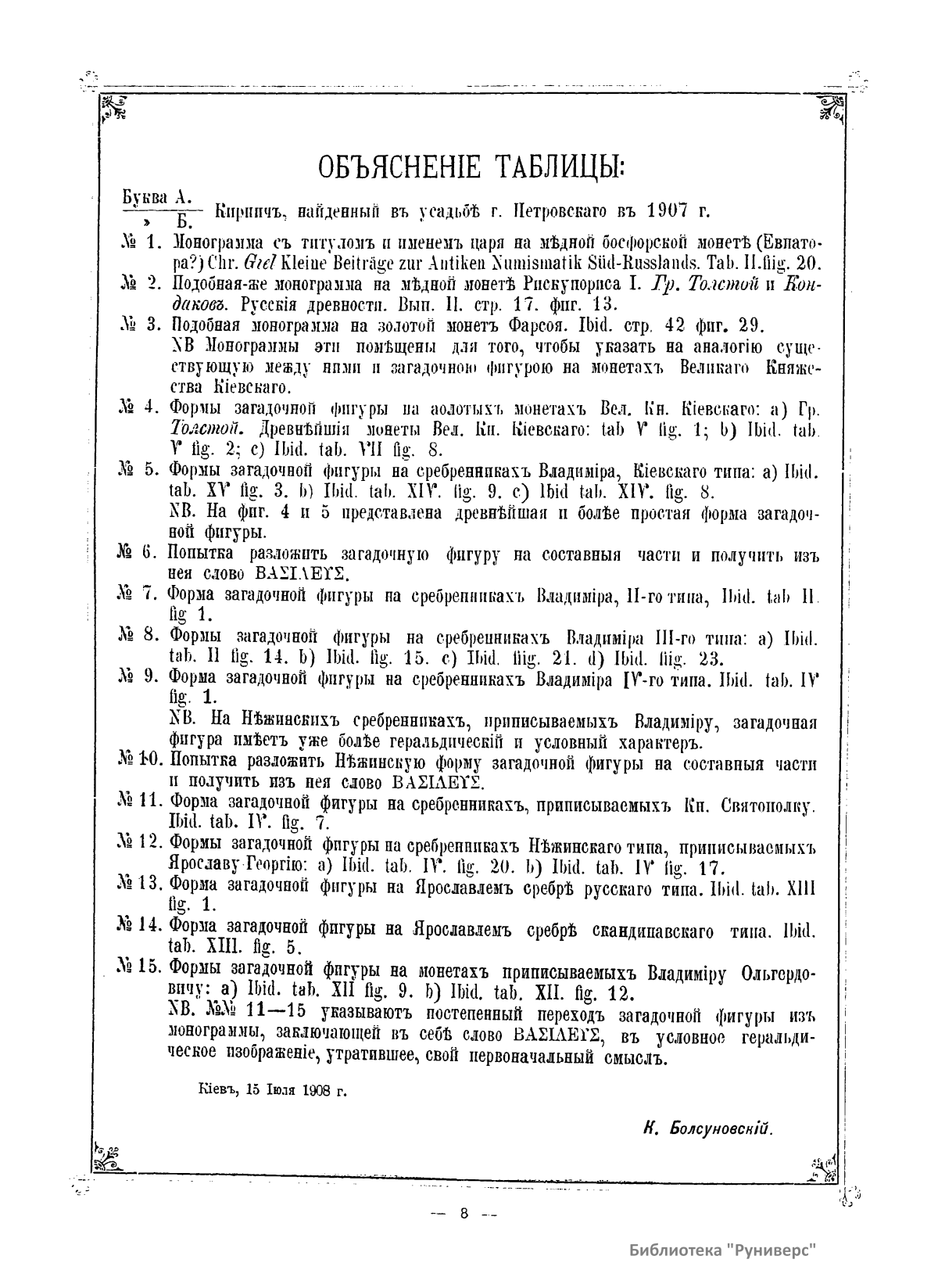 Геральдическое исследование, в котором автор отвечает на вопрос, что означает загадочный знак на монетах, приписываемых великому князю Владимиру Святому. Сделать вывод ему помогают результаты раскопок в усадьбе Г. Петровского в 1907 г., когда был обнаружен кусок изразца с начертаниями своеобразной фигуры, аналогичной изображению на монетах.