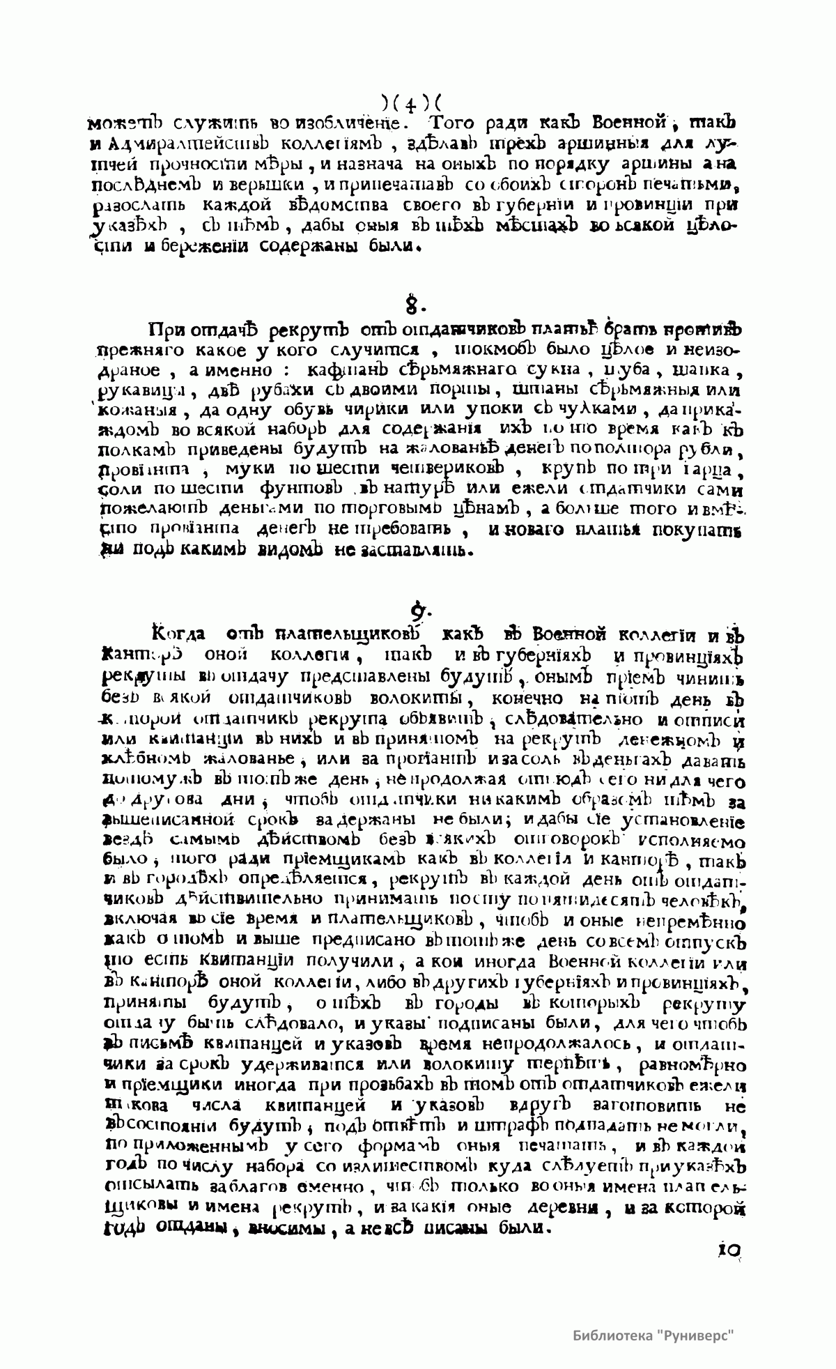 Генеральное учрежденiе. О ежегодномъ зборѣ съ государства рекрутъ, о командированiи для прiема оныхъ конвоевъ, и во отвращенiе всякихъ при томъ неполезностей, о штрафахъ и наказанiяхъ за вины, кто какъ въ приемѣ такъ и въ отдачѣ неистинною поступать будетѣ