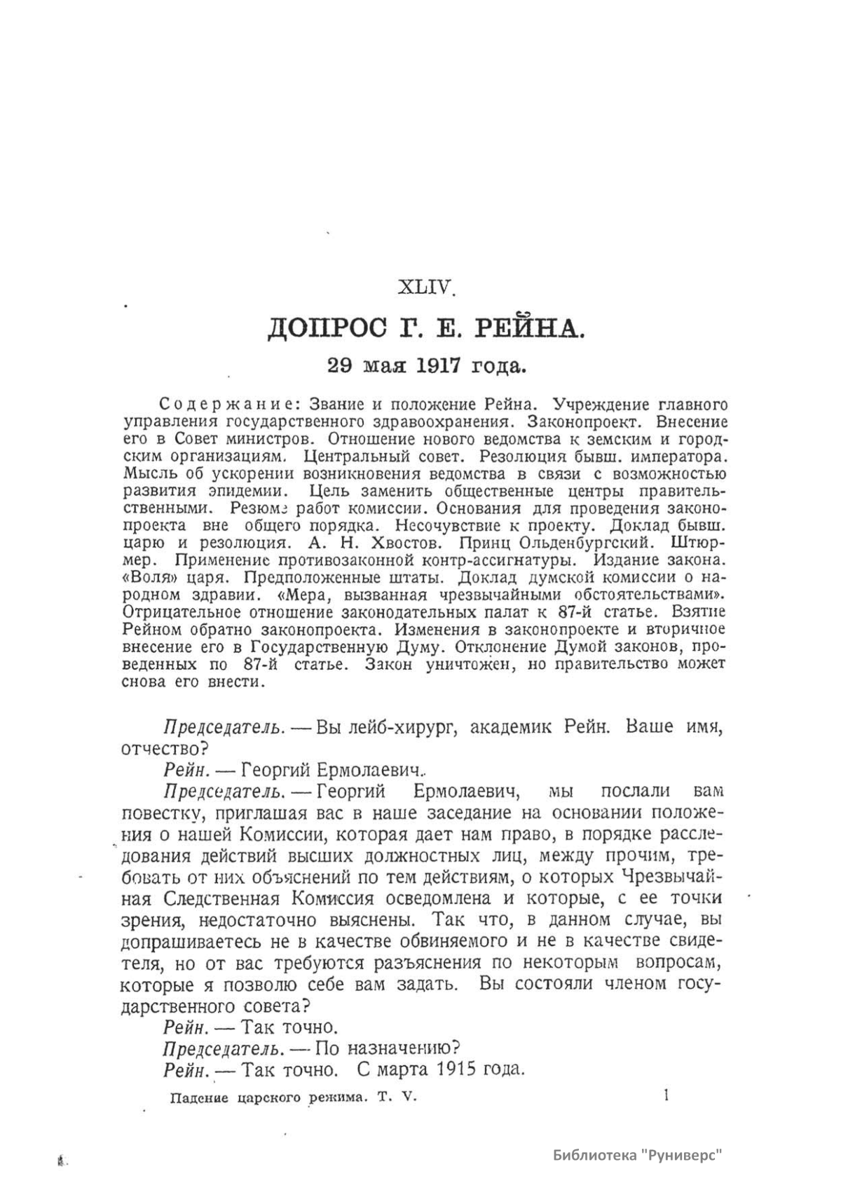 В издании опубликованы стенографические отчеты допросов и показаний, данных в 1917 г. в чрезвычайной следственной комиссии временного правительства. В VII томе (стр. 299) находится именной указатель ко всем томам. Чрезвычайная следственная комиссия Временного правительства для расследования противозаконных по должности действий бывших министров, главноуправляющих и прочих высших должностных лиц как гражданского, так и военного и морского ведомств – чрезвычайный следственный орган, учрежденный временным правительством после февральской революции. 5 марта (ст. ст.) 1917 г. был опубликован указ Временного правительства о создании ЧСК – в октябре 1917 г. расследования ЧСК фактически прекратились, в чем далеко не последнюю роль сыграл приход к власти партии большевиков. В современной исторической литературе разработка темы ЧСК находится лишь в начальной стадии.