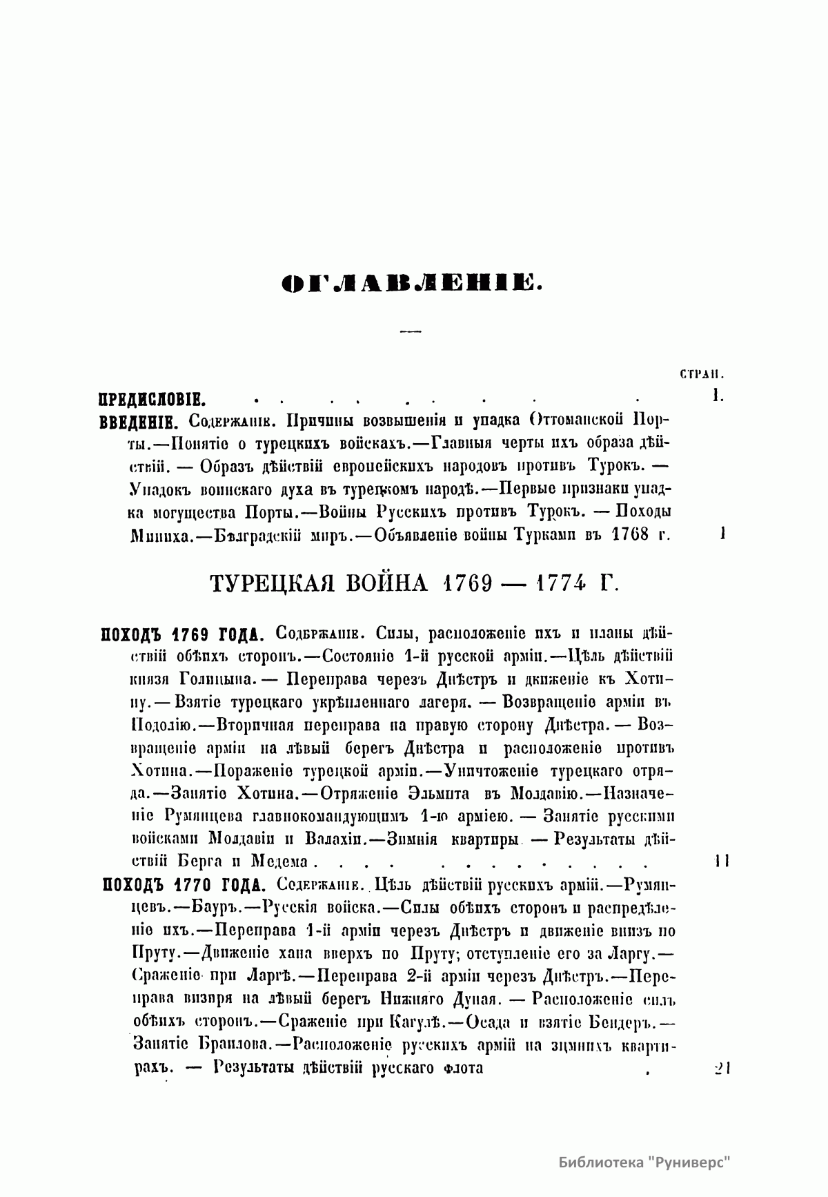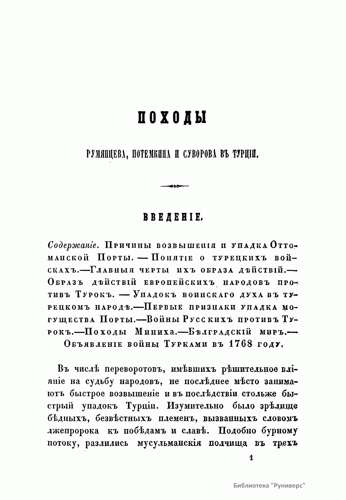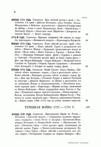 В настоящем сочинении подробно описаны две русско-турецкие войны в царствование императрицы Екатерины II (1769 – 1774; 1787 – 1791). К изданию прилагаются: карта пространства, служившего главным театром описанных войн; планы сражений при Кагуле и Рымнике; план Измаильского штурма. Потемкин Григорий Александрович (1739 – 1791) – русский государственный и военный деятель, генерал-фельдмаршал, организатор дворцового переворота 1762 г., фаворит и ближайший помощник Екатерины II. Способствовал освоению Северного Причерноморья, руководил строительством Черноморского флота. После присоединения Крыма получил титул светлейшего князя Таврического. Главнокомандующий русской армией в русско-турецкой войне 1787 – 1791 гг. Румянцев-Задунайский Петр Александрович (1725 – 1796) – граф (1744), русский полководец, генерал-фельдмаршал (1770). В Семилетней войне овладел крепостью Кольберг (Колобжег). С 1764 г. – президент Малороссийской коллегии. В русско-турецкой войне 1768 – 1774 гг. одержал победы при Рябой Могиле, Ларге и Кагуле (1770). Впервые применил сочетание каре, колонн и легких батальонов, положив начало зарождению новой тактики колонн и рассыпного строя. Имеет военно-теоретические работы. Суворов Александр Васильевич (1729 или 1730 – 1800), граф Рымникский (1789), князь Италийский (1799), русский полководец, генералиссимус (1799). Начал службу капралом в 1748 г. Участник семилетней войны. Во время русско-турецких войн (1749 – 1774, 1787 – 1791) одержал победы при Козлудже (1774), Кинбурне (1787), Фокшанах (1789), Рымнике (1789) и штурмом овладел крепостью Измаил (1790). При императоре Павле I в опале. В 1799 г. блестяще провел Итальянский и Швейцарские походы, разбив французские войска на рр. Адда и Требия и при Нови, а затем перешел швейцарские Альпы и вышел из окружения. Автор военно-теоретических работ. Создал оригинальную и прогрессивную систему взглядов на способы ведения войны и боя, воспитания и обучения войск, во многом опередив свое время. Стратегия Суворова носила наступательный характер, ставила главной задачей полный разгром противника в полевом сражении. Развил тактику колонн и рассыпного строя. Не проиграл ни одного сражения.