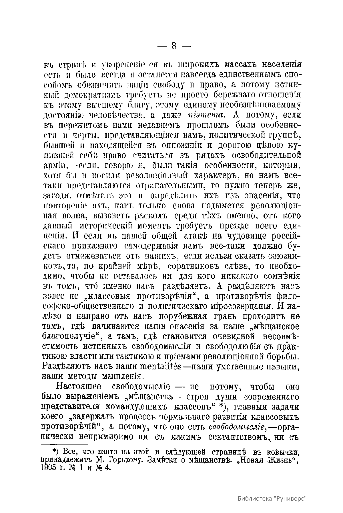 Автор еще в юности был вовлечен в политическое движение (общался с народовольцами, затем вступил в конституционно-демократическую партию, но симпатизировал и более левым партиям), но в годы первой русской революции выступил против нигилистких перегибов в политике. В сданной работе он говорит о том, что при определенных условиях освободительное движение может смениться и худшей из реакций, даже не той, которую делает, опираясь на пулеметы совершенно эмансипировавшийся от всяких правовых понятий и норм военный, а основывающейся на противоречиях психологических – принципиальной невозможности допустить, признать право на существование точки зрения другого. Автор напоминает, что всего более насилия и жестокости совершено было в мире именно теми, кто веровал в спасительность единой доктрины, которая обновит мир, облагодетельствует человечество. Выход, который видит Баженов, один – культура есть безусловная ценность, и укрепление и углубление культуры, укоренение ея в широких массах населения является единственным способом обеспечить нации свободу и право.