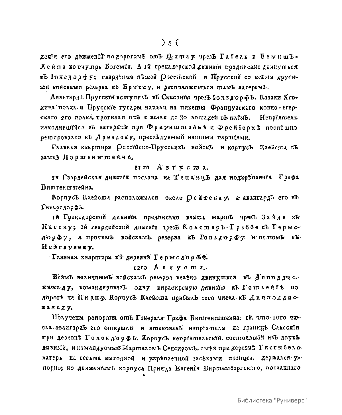 Журналъ Военныхъ движенiй и дѣйствiй Россiйско-императорскихъ и королевско Прусскихъ армiй со времени прекращенiя послѣдняго между ими и Армiями Французскими перемирiя т.е. с 5/17 Августа 1813 года