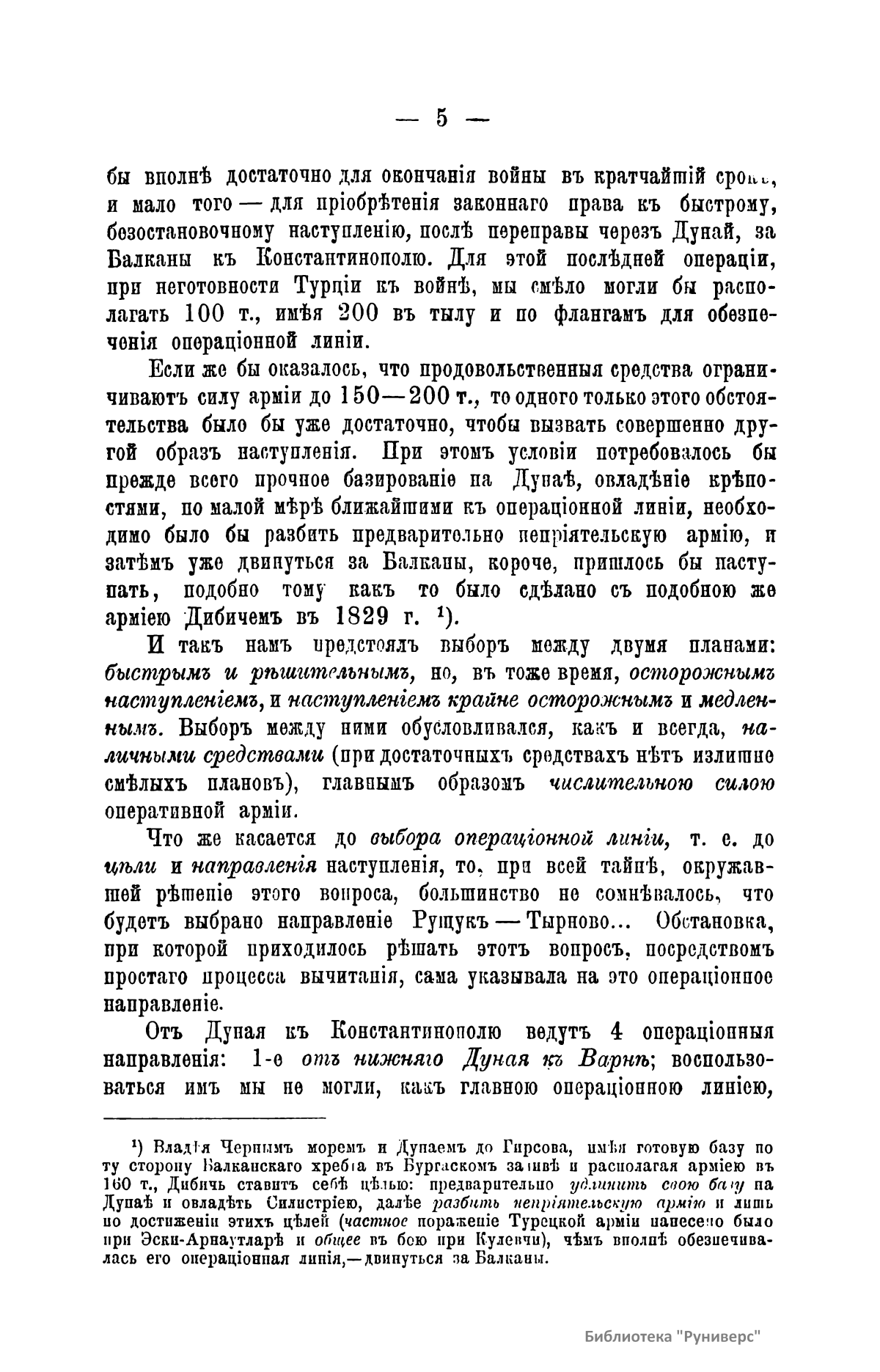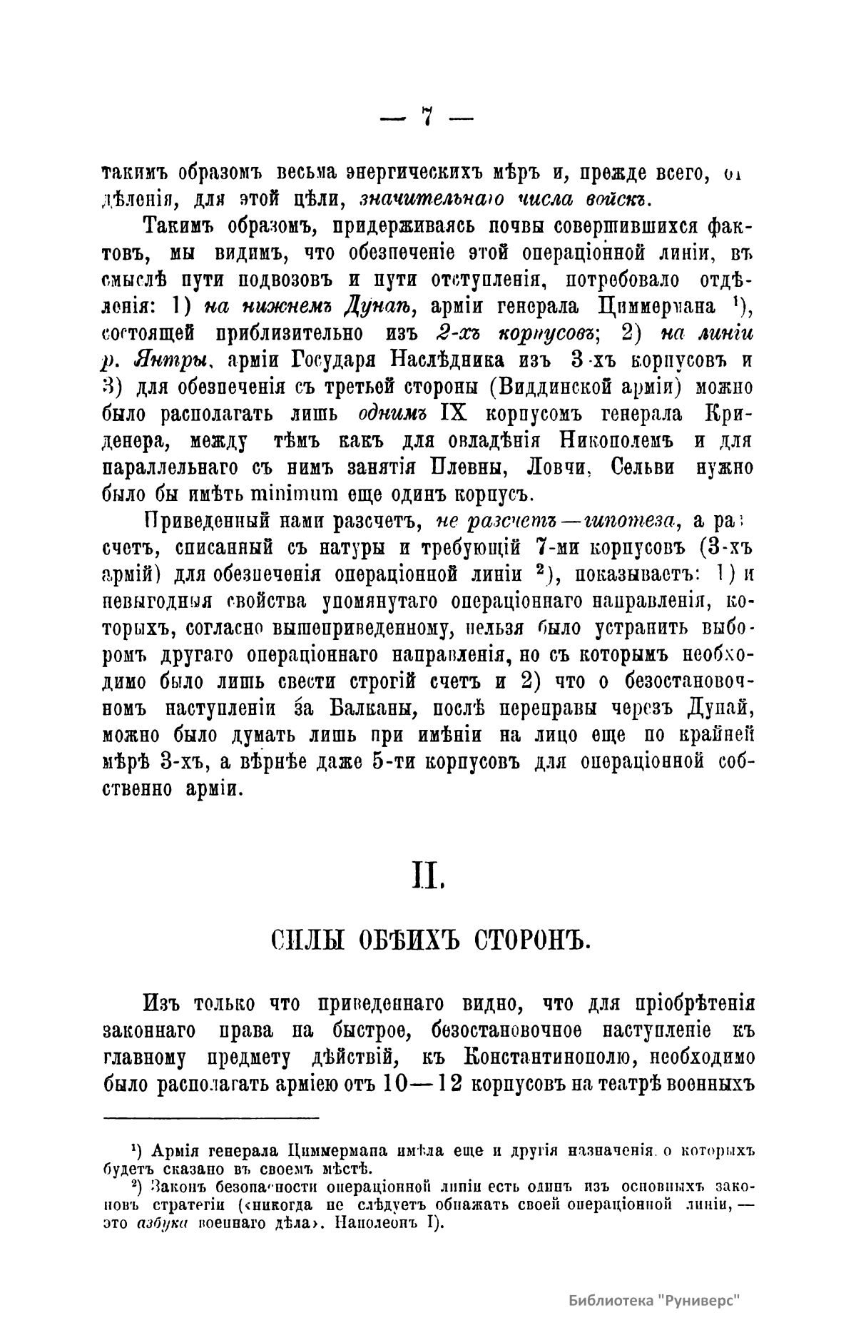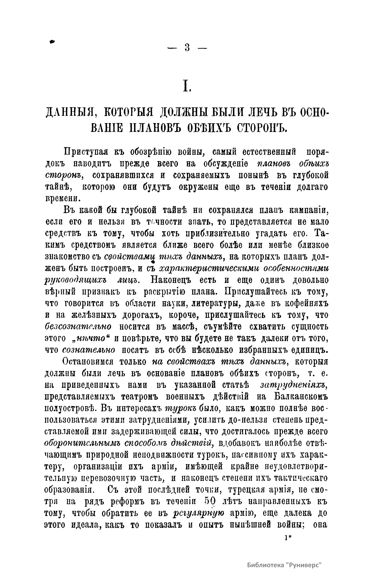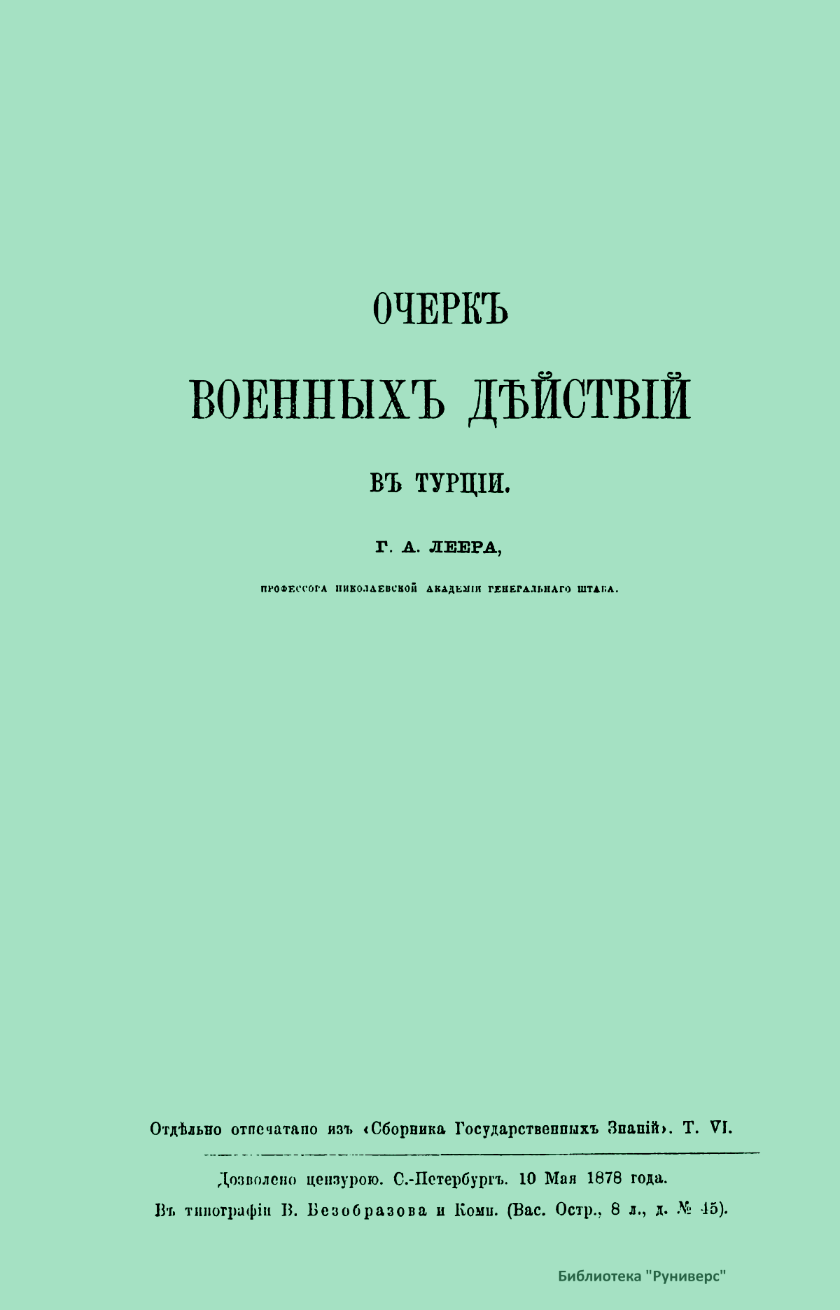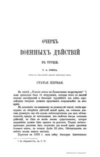Очерк посвящен первому периоду кампании 1877 г. в русско-турецкой войне 1877 – 1878 гг. Включает главы: 1. Данные, которые должны были лечь в основание планов обеих сторон (3). 2. Силы обеих сторон (7). 3. Сосредоточение армии на Дунае (11). 4. 1-й (Дунайский) период кампании (19): подготовка переправы (32); переправа на нижнем Дунае (41); переправа у Зимницы – Систове (44). Русско-турецкая война 1877 – 1878 гг. начата Россией для укрепления влияния на Балканах. Завершилась Сан-Стефанским миром 1878 г., решения которого пересмотрены на Берлинском конгрессе 1878 г. Способствовала освобождению народов Балканского п-ва от османского ига.